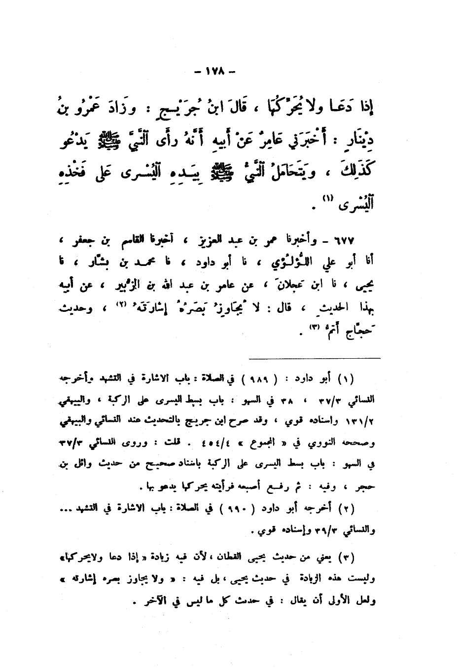 وَأَخْبَرَنَا عُمَرُ بْنُ عَبْدِ الْعَزِيزِ، أَخْبَرَنَا الْقَاسِمُ بْنُ جَعْفَرٍ، أَنَا أَبُو عَلِيٍّ اللُّؤْلُئِيُّ، نَا أَبُو دَاوُدَ، نَا مُحَمَّدُ بْنُ بَشَّارٍ، نَا يَحْيَى، نَا ابْنُ عَجْلانَ، عَنْ عَامِرِ بْنِ عَبْدِ اللَّهِ بْنِ الزُّبَيْرِ، عَنْ أَبِيهِ، بِهَذَا الْحَدِيثِ، قَالَ: «لَا يُجَاوِزُ بَصَرُهُ إِشَارَتَهُ»، وَحَدِيثُ حَجَّاجٍ أَتَمُّ