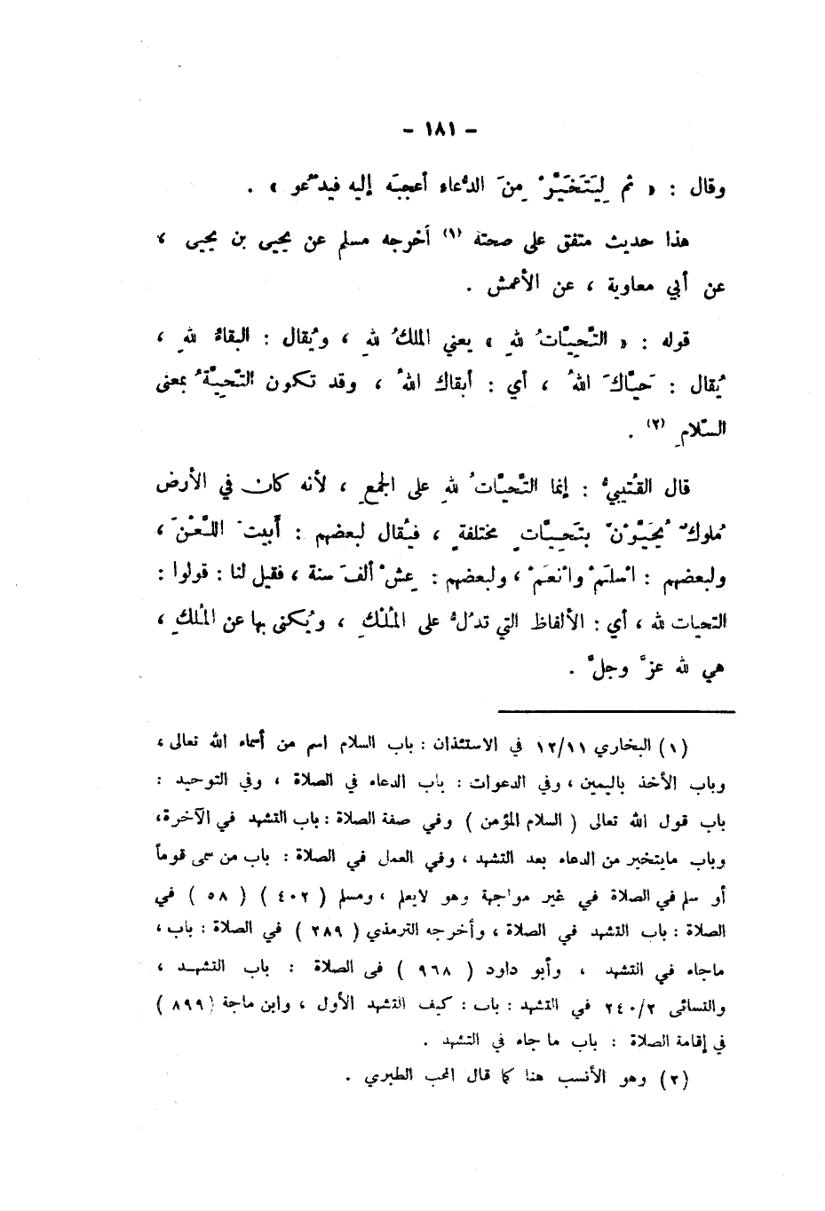 قَوْلُهُ: «التَّحِيَّاتُ لِلَّهِ» يَعْنِي الْمُلْكُ لِلَّهِ، وَيُقَالُ: الْبَقَاءُ لِلَّهِ، يُقَالُ: حَيَّاكَ اللَّهُ، أَيْ: أَبْقَاكَ اللَّهُ، وَقَدْ تَكُونُ التَّحِيَّةُ بِمَعْنَى السَّلامِ.