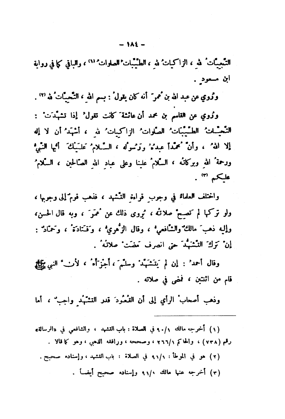 وَاخْتَلَفَ الْعُلَمَاءُ فِي وُجُوبِ قِرَاءَةِ التَّشَهُّدِ، فَذَهَبَ قَوْمٌ إِلَى وُجُوبِهَا، وَلَوْ تَرَكَهَا لَمْ تَصِحَّ صَلاتُهُ، يُرْوَى ذَلِكَ عَنْ عُمَرَ، وَبِهِ قَالَ الْحَسَنُ، وَإِلَيْهِ ذَهَبَ مَالِكٌ، وَالشَّافِعِيُّ، وَقَالَ الزُّهْرِيُّ، وَقَتَادَةُ، وَحَمَّادٌ: إِنْ تَرَكَ التَّشَهُّدَ حَتَّى انْصَرَفَ مَضَتْ صَلاتُهُ.