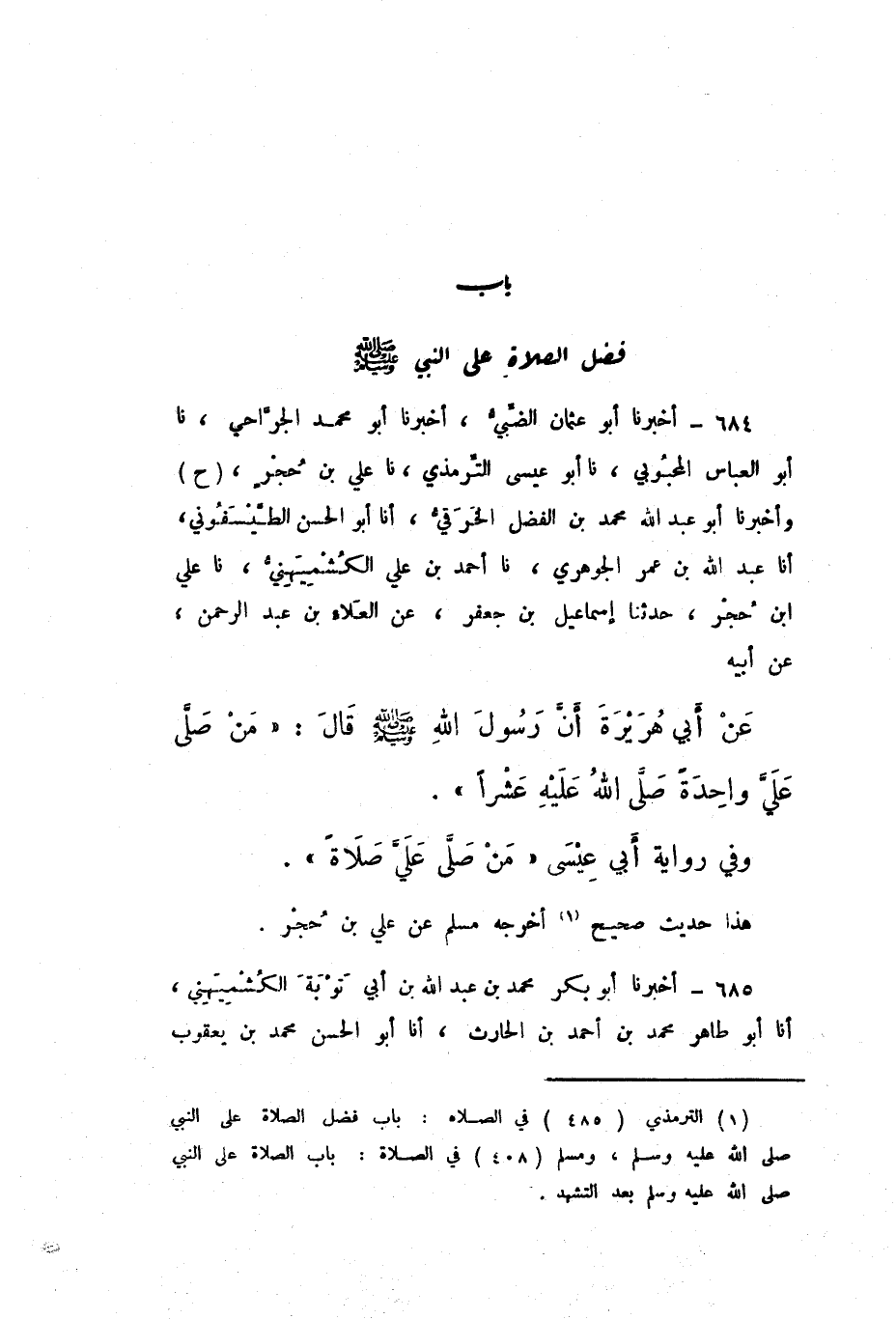 ح وَأَخْبَرَنَا أَبُو عَبْدِ اللَّهِ مُحَمَّدُ بْنُ الْفَضْلِ الْخَرَقِيُّ، أَنَا أَبُو الْحَسَنِ الطَّيْسَفُونِيُّ، أَنَا عَبْدُ اللَّهِ بْنُ عُمَرَ الْجَوْهَرِيُّ، نَا أَحْمَدُ بْنُ عَلِيٍّ الْكُشْمِيهَنِيُّ، نَا عَلِيُّ بْنُ حُجْرٍ، حَدَّثَنَا إِسْمَاعِيلُ بْنُ جَعْفَرٍ، عَنِ الْعَلاءِ بْنِ عَبْدِ الرَّحْمَنِ، عَنْ أَبِيهِ، عَنْ أَبِي هُرَيْرَةَ، أَنَّ رَسُولَ اللَّهِ صَلَّى اللهُ عَلَيْهِ وَسَلَّمَ، قَالَ: «مَنْ صَلَّى عَلَيَّ وَاحِدَةً صَلَّى اللَّهُ عَلَيْهِ عَشْرًا».