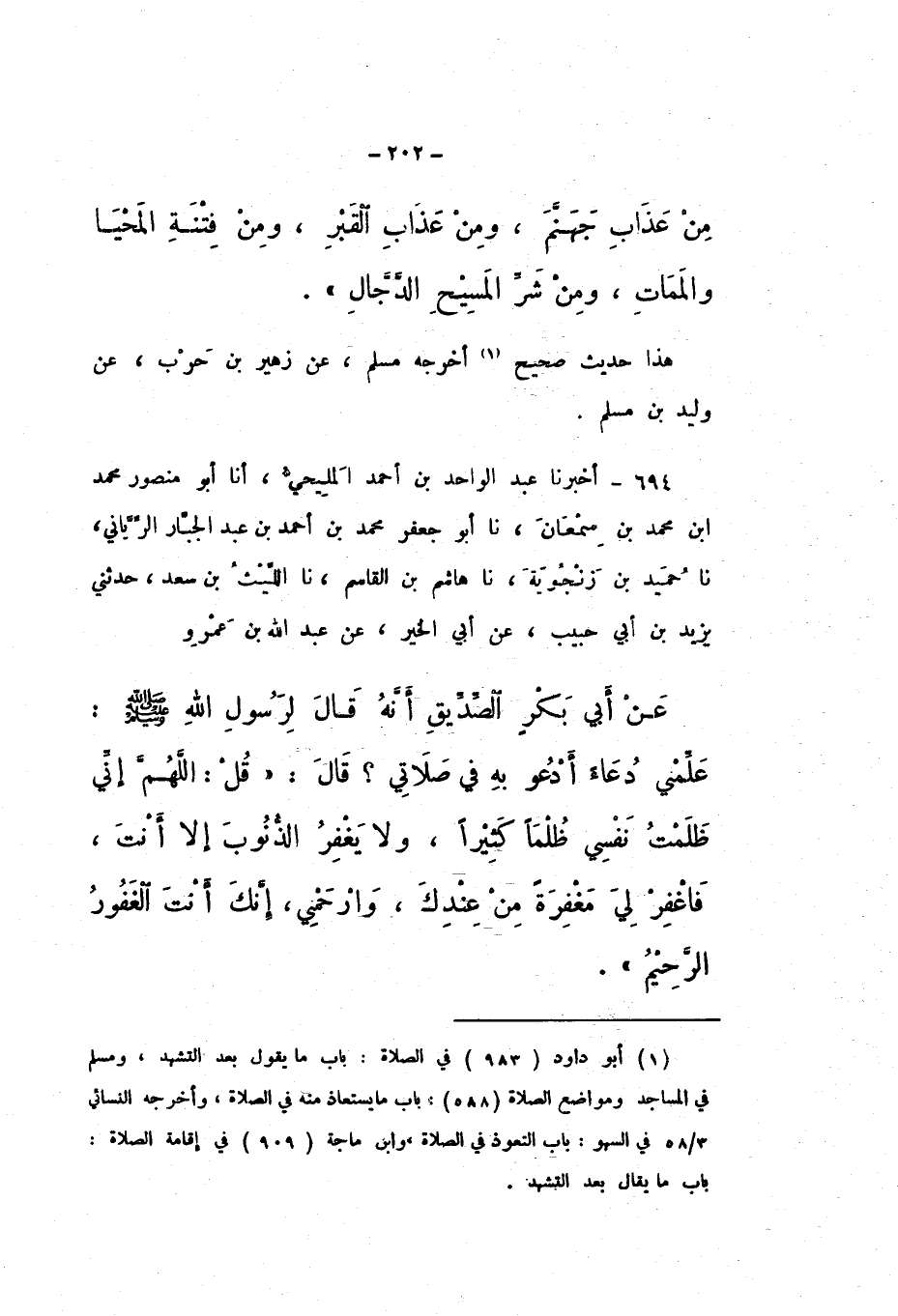 694 - أَخْبَرَنَا عَبْدُ الْوَاحِدِ بْنُ أَحْمَدَ الْمَلِيحِيُّ، أَنَا أَبُو مَنْصُورٍ مُحَمَّدُ بْنُ مُحَمَّدِ بْنِ سَمْعَانَ، نَا أَبُو جَعْفَرٍ مُحَمَّدُ بْنُ أَحْمَدَ بْنِ عَبْدِ الْجَبَّارِ الرَّيَّانِيُّ، نَا حُمَيْدُ بْنُ زَنْجُوَيْهِ، نَا هَاشِمُ بْنُ الْقَاسِمِ، نَا اللَّيْثُ بْنُ سَعْدٍ، حَدَّثَنِي يَزِيدُ بْنُ أَبِي حَبِيبٍ، عَنْ أَبِي الْخَيْرِ، عَنْ عَبْدِ اللَّهِ بْنِ عَمْرٍو، عَنْ أَبِي بَكْرٍ الصِّدِّيقِ، أَنَّهُ قَالَ لِرَسُولِ اللَّهِ صَلَّى اللهُ عَلَيْهِ وَسَلَّمَ: " عَلِّمْنِي دُعَاءً أَدْعُو بِهِ فِي صَلاتِي؟ قَالَ: قُلِ: اللَّهُمَّ إِنِّي ظَلَمْتُ نَفْسِي ظُلْمًا كَثِيرًا، وَلا يَغْفِرُ الذُّنُوبَ إِلا أَنْتَ، فَاغْفِرْ لِي مَغْفِرَةً مِنْ عِنْدِكَ، وَارْحَمْنِي، إِنَّكَ أَنْتَ الْغَفُورُ الرَّحِيمُ ".