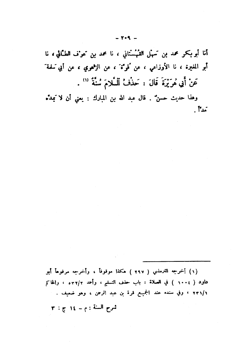 أَنَا أَبُو بَكْرٍ مُحَمَّدُ بْنُ سَهْلٍ الْقُهُسْتَانِيُّ، نَا مُحَمَّدُ بْنُ عَوْفٍ الطَّائِيُّ، نَا أَبُو الْمُغِيرَةِ، نَا الأَوْزَاعِيُّ، عَنْ قُرَّةَ، عَنِ الزُّهْرِيِّ، عَنْ أَبِي سَلَمَةَ، عَنْ أَبِي هُرَيْرَةَ، قَالَ: «حَذْفُ السَّلامِ سُنَّةٌ».
