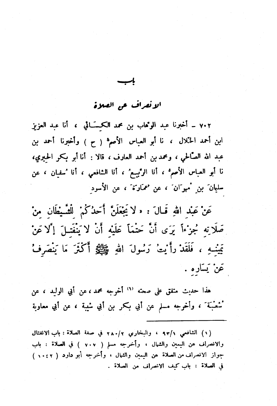 ح وَأَخْبَرَنَا أَحْمَدُ بْنُ عَبْدِ اللَّهِ الصَّالِحِيُّ، وَمُحَمَّدُ بْنُ أَحْمَدَ الْعَارِفُ، قَالا: أَنَا أَبُو بَكْرٍ الْحِيرِيُّ، نَا أَبُو الْعَبَّاسِ الأَصَمُّ، أَنَا الرَّبِيعُ، أَنَا الشَّافِعِيُّ، أَنَا سُفْيَانُ، عَنْ سُلَيْمَانَ بْنِ مِهْرَانَ، عَنْ عُمَارَةَ، عَنِ الأَسْوَدِ، عَنْ عَبْدِ اللَّهِ، قَالَ: «لَا يَجْعَلَنَّ أَحَدُكُمْ لِلشَّيْطَانِ مِنْ صَلاتِهِ جُزْءًا يَرَى أَنَّ حَتْمًا عَلَيْهِ أَنْ لَا يَنْفَتِلَ إِلا عَنْ يَمِينِهِ، فَلَقَدْ رَأَيْتُ رَسُولَ اللَّهِ صَلَّى اللهُ عَلَيْهِ وَسَلَّمَ أَكْثَرَ مَا يَنْصَرِفُ عَنْ يَسَارِهِ».