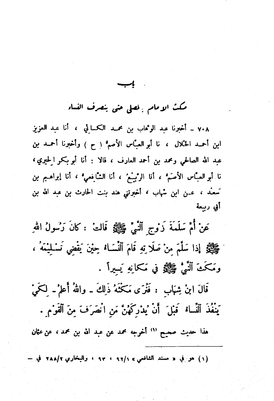ح وَأَخْبَرَنَا أَحْمَدُ بْنُ عَبْدِ اللَّهِ الصَّالِحِيُّ، وَمُحَمَّدُ بْنُ أَحْمَدَ الْعَارِفُ، قَالا: أَنا أَبُو بَكْرٍ الْحِيرِيُّ، نَا أَبُو الْعَبَّاسِ الأَصَمُّ، أَنَا الرَّبِيعُ، أَنَا الشَّافِعِيُّ، أَنَا إِبْرَاهِيمُ بْنُ سَعْدٍ، عَنِ ابْنِ شِهَابٍ، أَخْبَرَتْنِي هِنْدُ بِنْتُ الْحَارِثِ بْنِ عَبْدِ اللَّهِ بْنِ أَبِي رَبِيعَةَ، عَنْ أُمِّ سَلَمَةَ، زَوْجِ النَّبِيِّ صَلَّى اللهُ عَلَيْهِ وَسَلَّمَ، قَالَتْ: «كَانَ رَسُولُ اللَّهِ صَلَّى اللهُ عَلَيْهِ وَسَلَّمَ إِذَا سَلَّمَ مِنْ صَلاتِهِ قَامَ النِّسَاءُ حِينَ يَقْضِي تَسْلِيمَهُ، وَمَكَثَ النَّبِيُّ صَلَّى اللهُ عَلَيْهِ وَسَلَّمَ فِي مَكَانِهِ يَسِيرًا».