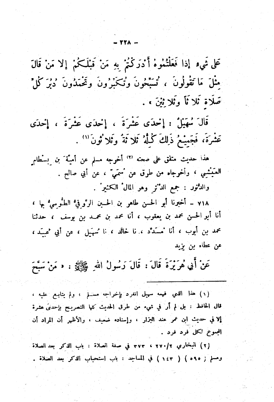 718 - أَخْبَرَنَا أَبُو الْحَسَنِ طَاهِرُ بْنُ الْحُسَيْنِ الرَّوْقِيُّ الطُّوسِيُّ بِهَا، أَنَا أَبُو الْحَسَنِ مُحَمَّدُ بْنُ يَعْقُوبَ، أَنَا مُحَمَّدُ بْنُ مُحَمَّدِ بْنِ يُوسُفَ، حَدَّثَنَا مُحَمَّدُ بْنُ أَيُّوبَ، أَنَا مُسَدَّدٌ، نَا خَالِدٌ، نَا سُهَيْلٌ، عَنْ أَبِي عُبَيْدٍ، عَنْ عَطَاءِ بْنِ يَزِيدَ، عَنْ أَبِي هُرَيْرَةَ، قَالَ: قَالَ رَسُولُ اللَّهِ صَلَّى اللهُ عَلَيْهِ وَسَلَّمَ: " مَنْ سَبَّحَ