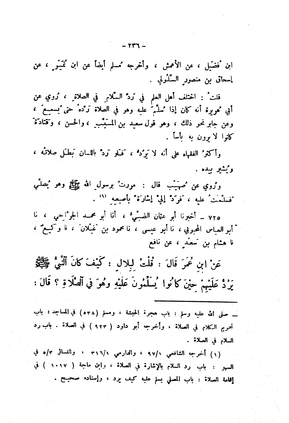 قَلْتُ: اخْتَلَفَ أَهْلُ الْعِلْمِ فِي رَدِّ السَّلامِ فِي الصَّلاةِ، رُوِيَ عَنْ أَبِي هُرَيْرَةَ أَنَّهُ كَانَ إِذَا سُلِّمَ عَلَيْهِ وَهُوَ فِي الصَّلاةِ، رَدَّهُ حَتَّى يُسْمِعَ، وَعَنْ جَابِرٍ نَحْوَ ذَلِكَ، وَهُوَ قَوْلُ سَعِيدِ بْنِ الْمُسَيِّبِ، وَالْحَسَنِ، وَقَتَادَةَ كَانُوا لَا يَرَوْنَ بِهِ بَأْسًا.