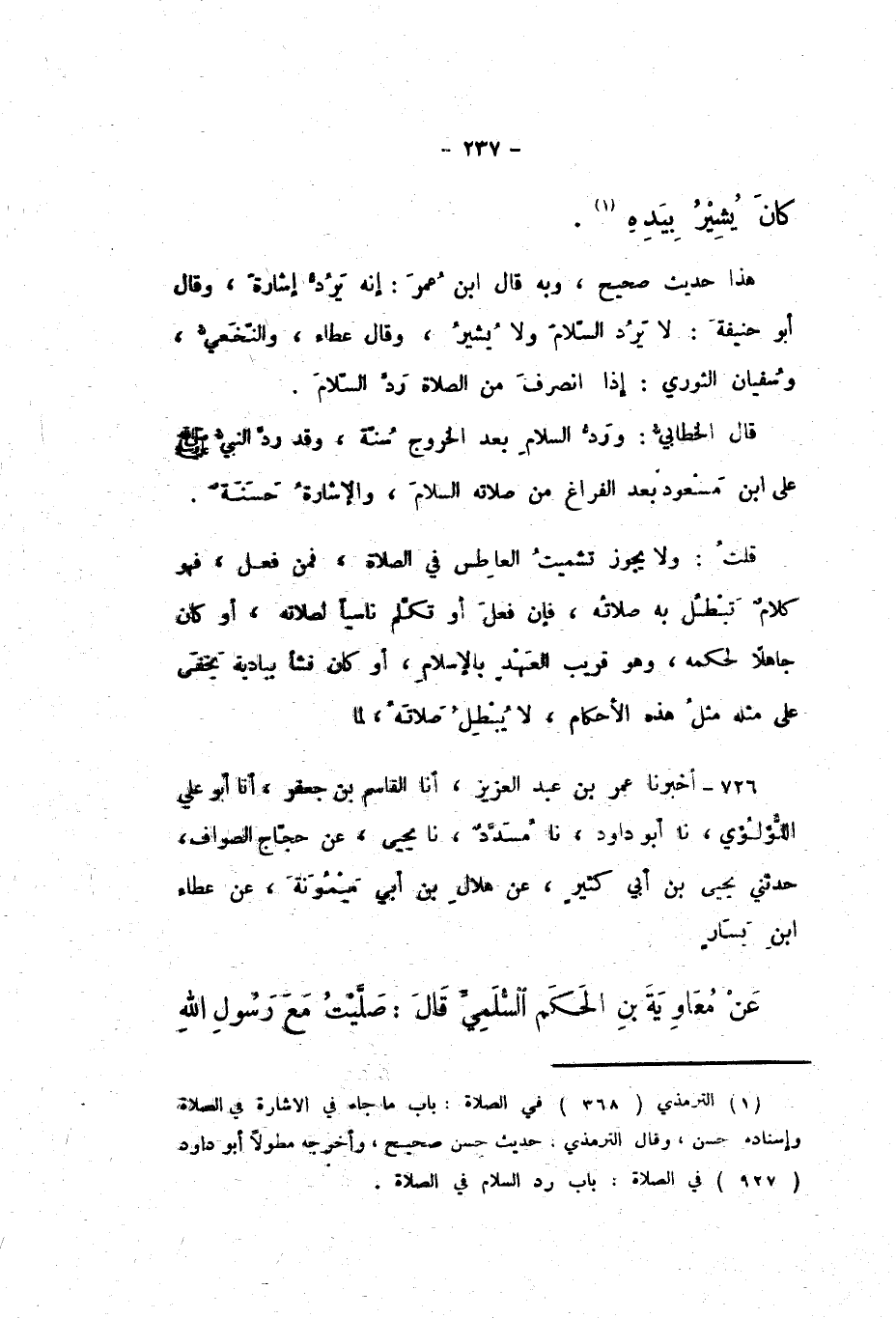 هَذَا حَدِيثٌ صَحِيحٌ، وَبِهِ قَالَ ابْنُ عُمَرَ: «إِنَّهُ يَرُدُّ إِشَارَةً»، وَقَالَ أَبُو حَنِيفَةَ: لَا يَرُدُّ السَّلامَ وَلا يُشِيرُ.