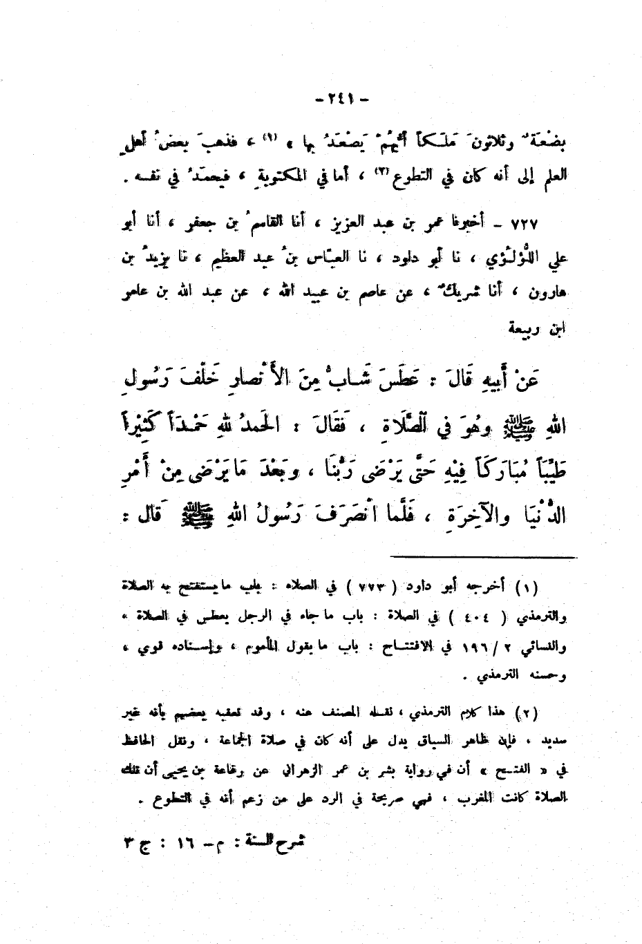 727 - أَخْبَرَنَا عُمَرُ بْنُ عَبْدِ الْعَزِيزِ، أَنَا الْقَاسِمُ بْنُ جَعْفَرٍ، أَنَا أَبُو عَلِيٍّ اللُّؤْلُئِيُّ، نَا أَبُو دَاوُدَ، نَا الْعَبَّاسُ بْنُ عَبْدِ الْعَظِيمِ، نَا يَزِيدُ بْنُ هَارُونَ، أَنَا شَرِيكٌ، عَنْ عَاصِمِ بْنِ عُبَيْدِ اللَّهِ، عَنْ عَبْدِ اللَّهِ بْنِ عَامِرِ بْنِ رَبِيعَةَ، عَنْ أَبِيهِ، قَالَ: عَطَسَ شَابٌّ مِنَ الأَنْصَارِ خَلْفَ رَسُولِ اللَّهِ صَلَّى اللهُ عَلَيْهِ وَسَلَّمَ وَهُوَ فِي الصَّلاةِ، فَقَالَ: الْحَمْدُ لِلَّهِ حَمْدًا كَثِيرًا طَيِّبًا مُبَارَكًا فِيهِ حَتَّى يَرْضَى رَبُّنَا، وَبَعْدَ مَا يَرْضَى مِنْ أَمْرِ الدُّنْيَا وَالآخِرَةِ، فَلَمَّا انْصَرَفَ رَسُولُ اللَّهِ صَلَّى اللهُ عَلَيْهِ وَسَلَّمَ قَالَ: «