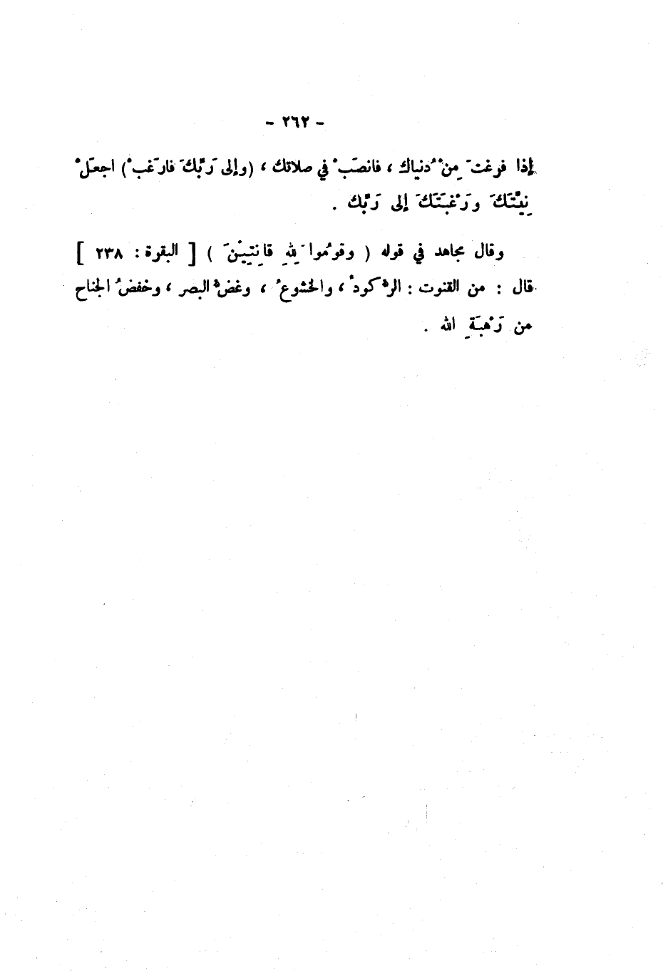 وَقَالَ مُجَاهِدٌ فِي قَوْلِهِ: {وَقُومُوا لِلَّهِ قَانِتِينَ} [الْبَقَرَة: 238]، قَالَ: مِنَ الْقُنُوتِ: الرُّكُودُ، وَالْخُشُوعُ، وَغَضُّ الْبَصَرِ، وَخَفْضُ الْجَنَاحِ مِنْ رَهْبَةِ اللَّهِ.