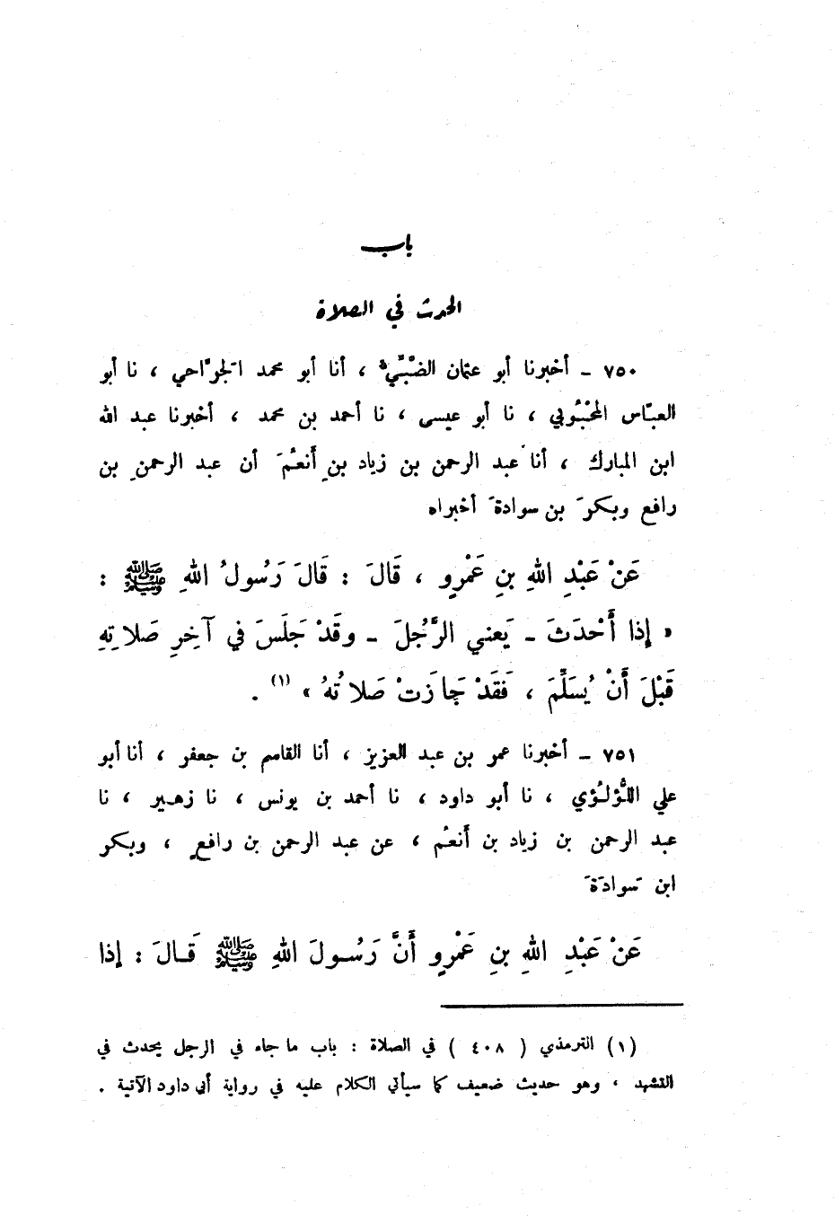 750 - أَخْبَرَنَا أَبُو عُثْمَانَ الضَّبِّيُّ، أَنَا أَبُو مُحَمَّدٍ الْجَرَّاحِيُّ، نَا أَبُو الْعَبَّاسِ الْمَحْبُوبِيُّ، نَا أَبُو عِيسَى، نَا أَحْمَدُ بْنُ مُحَمَّدٍ، أَخْبَرَنَا عَبْدُ اللَّهِ بْنُ الْمُبَارَكِ، أَنَا عَبْدُ الرَّحْمَنِ بْنُ زِيَادِ بْنِ أَنْعُمَ، أَنَّ عَبْدَ الرَّحْمَنِ بْنَ رَافِعٍ، وَبَكْرَ بْنَ سَوَادَةَ أَخْبَرَاهُ عَنْ عَبْدِ اللَّهِ بْنِ عَمْرٍو، قَالَ: قَالَ رَسُولُ اللَّهِ صَلَّى اللهُ عَلَيْهِ وَسَلَّمَ: «إِذَا أَحْدَثَ، يَعْنِي الرَّجُلَ، وَقَدْ جَلَسَ فِي آخِرِ صَلاتِهِ قَبْلَ أَنْ يُسَلِّمَ، فَقَدْ جَازَتْ صَلاتُهُ»