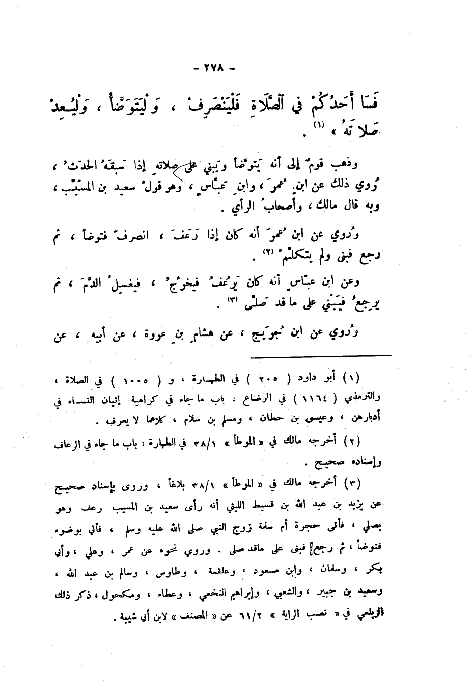 وَذَهَبَ قَوْمٌ إِلَى أَنَّهُ يَتَوَضَّأَ وَيَبْنِي عَلَى صَلاتِهِ إِذَا سَبَقَهُ الْحَدَثُ، رُوِيَ ذَلِكَ عَنِ ابْنِ عُمَرَ، وَابْنِ عَبَّاسٍ، وَهُوَ قَوْلُ سَعِيدِ بْنِ الْمُسَيِّبِ، وَبِهِ قَالَ مَالِكٌ، وَأَصْحَابُ الرَّأْيِ، وَرُوِيَ عَنِ ابْنِ عُمَرَ، أَنَّهُ كَانَ إِذَا رَعَفَ، انْصَرَفَ فَتَوَضَّأَ، ثُمَّ رَجَعَ فَبَنَى وَلَمْ يَتَكَلَّمْ.