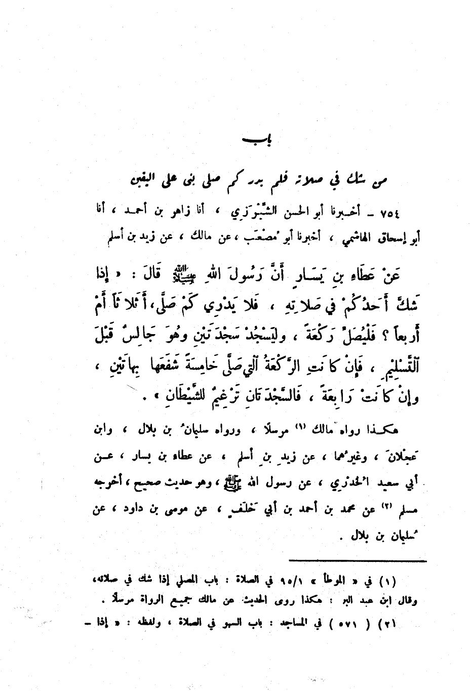 754 - أَخْبَرَنَا أَبُو الْحَسَنِ الشِّيرَزِيُّ، أَنَا زَاهِرُ بْنُ أَحْمَدَ، أَنَا أَبُو إِسْحَاقَ الْهَاشِمِيُّ، أَخْبَرَنَا أَبُو مُصْعَبٍ، عَنْ مَالِكٍ، عَنْ زَيْدِ بْنِ أَسْلَمَ، عَنْ عَطَاءِ بْنِ يَسَارٍ، أَنَّ رَسُولَ اللَّهِ صَلَّى اللهُ عَلَيْهِ وَسَلَّمَ قَالَ: «إِذَا شَكَّ أَحَدُكُمْ فِي صَلاتِهِ، فَلا يَدْرِي كَمْ صَلَّى، أَثَلاثًا أَمْ أَرْبَعًا؟ فَلْيُصَلِّ رَكْعَةً، وَلِيَسْجُدْ سَجْدَتَيْنِ وَهُوَ جَالِسٌ قَبْلَ التَّسْلِيمِ، فَإِنْ كَانَتِ الرَّكْعَةُ الَّتِي صَلَّى خَامِسَةً شَفَعَهَا بِهَاتَيْنِ، وَإِنْ كَانَتْ رَابِعَةً، فَالسَّجْدَتَانِ تَرْغِيمٌ لِلشَّيْطَانِ».
