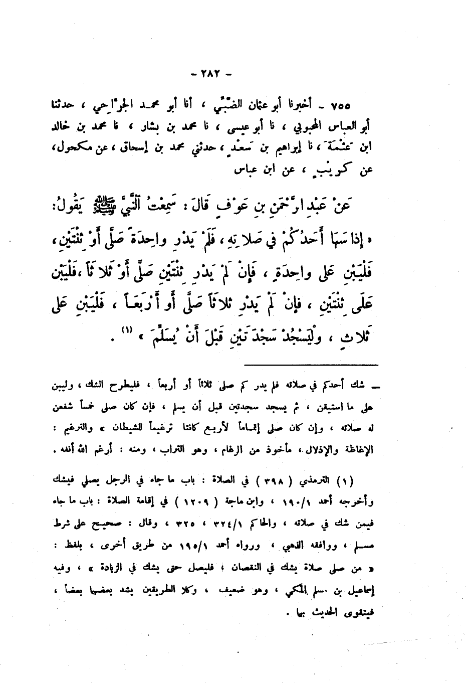 755 - أَخْبَرَنَا أَبُو عُثْمَانَ الضَّبِّيُّ، أَنَا أَبُو مُحَمَّدٍ الْجَرَّاحِيُّ، حَدَّثَنَا أَبُو الْعَبَّاسِ الْمَحْبُوبِيُّ، نَا أَبُو عِيسَى، نَا مُحَمَّدُ بْنُ بَشَّارٍ، نَا مُحَمَّدُ بْنُ خَالِدِ بْنِ عَثْمَةَ، نَا إِبْرَاهِيمُ بْنُ سَعْدٍ، حَدَّثَنِي مُحَمَّدُ بْنُ إِسْحَاقَ، عَنْ مَكْحُولٍ، عَنْ كُرَيْبٍ، عَنِ ابْنِ عَبَّاسٍ، عَنْ عَبْدِ الرَّحْمَنِ بْنِ عَوْفٍ، قَالَ: سَمِعْتُ النَّبِيَّ صَلَّى اللهُ عَلَيْهِ وَسَلَّمَ يَقُولُ: «إِذَا سَهَا أَحَدُكُمْ فِي صَلاتِهِ، فَلَمْ يَدْرِ وَاحِدَةً صَلَّى أَوْ ثِنْتَيْنِ، فَلْيَبْنِ عَلَى وَاحِدَةٍ، فَإِنْ لَمْ يَدْرِ ثِنْتَيْنِ صَلَّى أَوْ ثَلاثًا، فَلْيَبْنِ عَلَى ثِنْتَيْنِ، فَإِنْ لَمْ يَدْرِ ثَلاثًا صَلَّى أَوْ أَرْبَعًا، فَلْيَبْنِ عَلَى ثَلاثٍ، وَلْيَسْجُدْ سَجْدَتَيْنِ قَبْلَ أَنْ يُسَلِّمَ».