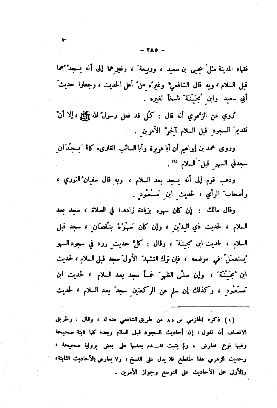 فُقَهَاءِ الْمَدِينَةِ مِثْلُ يَحْيَى بْنِ سَعِيدٍ، وَرَبِيعَةَ، وَغَيْرِهِمَا إِلَى أَنَّهُ يَسْجُدُهُمَا قَبْلَ السَّلامِ، وَبِهِ قَالَ الشَّافِعِيُّ، وَغَيْرُهُ مِنْ أَهْلِ الْحَدِيثِ، وَجَعَلُوا حَدِيثَ أَبِي سَعِيدٍ، وَابْنِ بُحَيْنَةَ نَاسِخًا لِغَيْرِهِ.