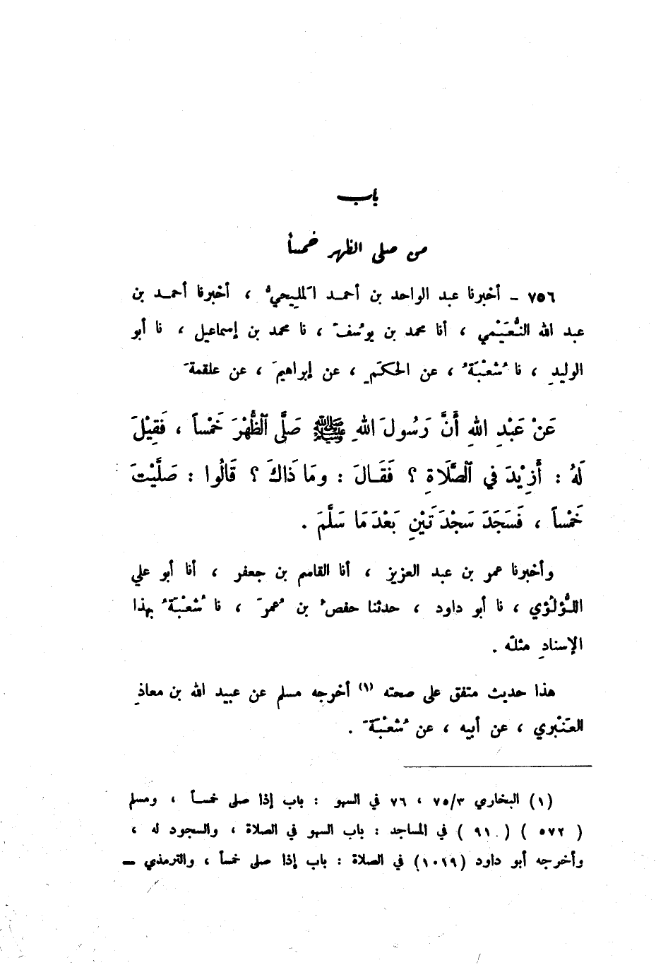 756 - أَخْبَرَنَا عَبْدُ الْوَاحِدِ بْنُ أَحْمَدَ الْمَلِيحِيُّ، أَخْبَرَنَا أَحْمَدُ بْنُ عَبْدِ اللَّهِ النُّعَيْمِيُّ، أَنَا مُحَمَّدُ بْنُ يُوسُفَ، نَا مُحَمَّدُ بْنُ إِسْمَاعِيلَ، نَا أَبُو الْوَلِيدِ، نَا شُعْبَةُ، عَنِ الْحَكَمِ، عَنْ إِبْرَاهِيمَ، عَنْ عَلْقَمَةَ، عَنْ عَبْدِ اللَّهِ، أَنَّ رَسُولَ اللَّهِ صَلَّى اللهُ عَلَيْهِ وَسَلَّمَ " صَلَّى الظُّهْرَ خَمْسًا، فَقِيلَ لَهُ: أَزِيدَ فِي الصَّلاةِ؟ فَقَالَ: " وَمَا ذَاكَ؟ قَالُوا: صَلَّيْتَ خَمْسًا، فَسَجَدَ سَجْدَتَيْنِ بَعْدَمَا سَلَّمَ ".