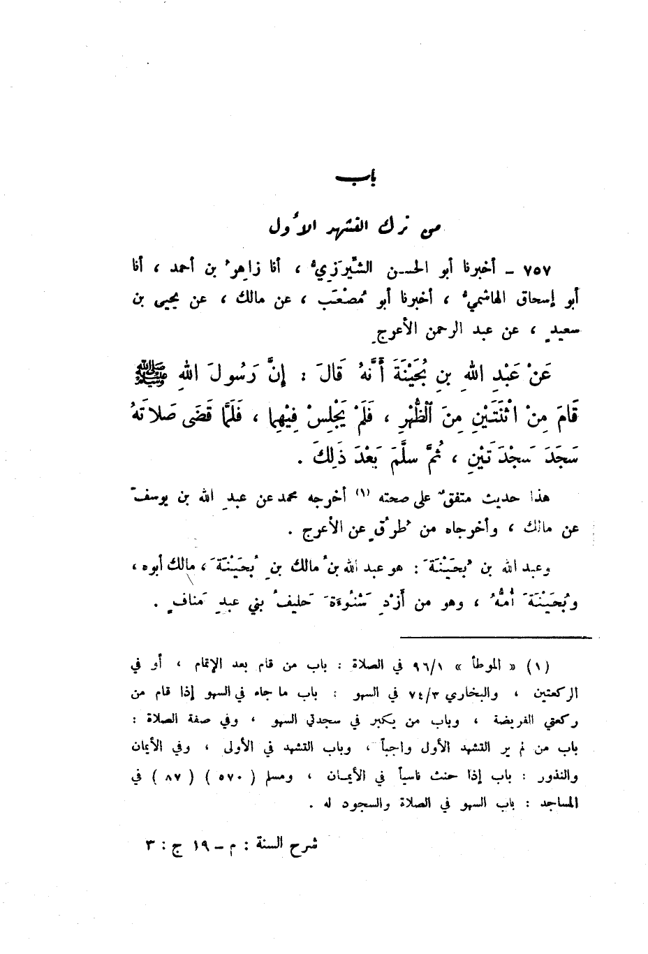757 - أَخْبَرَنَا أَبُو الْحَسَنِ الشِّيرَزِيُّ، أَنَا زَاهِرُ بْنُ أَحْمَدَ، أَنَا أَبُو إِسْحَاقَ الْهَاشِمِيُّ، أَخْبَرَنَا أَبُو مُصْعَبٍ، عَنْ مَالِكٍ، عَنْ يَحْيَى بْنِ سَعِيدٍ، عَنْ عَبْدِ الرَّحْمَنِ الأَعْرَجِ، عَنْ عَبْدِ اللَّهِ بْنِ بُحَيْنَةَ، أَنَّهُ قَالَ: إِنَّ رَسُولَ اللَّهِ صَلَّى اللهُ عَلَيْهِ وَسَلَّمَ «قَامَ مِنَ اثْنَتَيْنِ مِنَ الظُّهْرِ، فَلَمْ يَجْلِسْ فِيهِمَا، فَلَمَّا قَضَى صَلاتَهُ سَجَدَ سَجْدَتَيْنِ، ثُمَّ سَلَّمَ بَعْدَ ذَلِكَ».