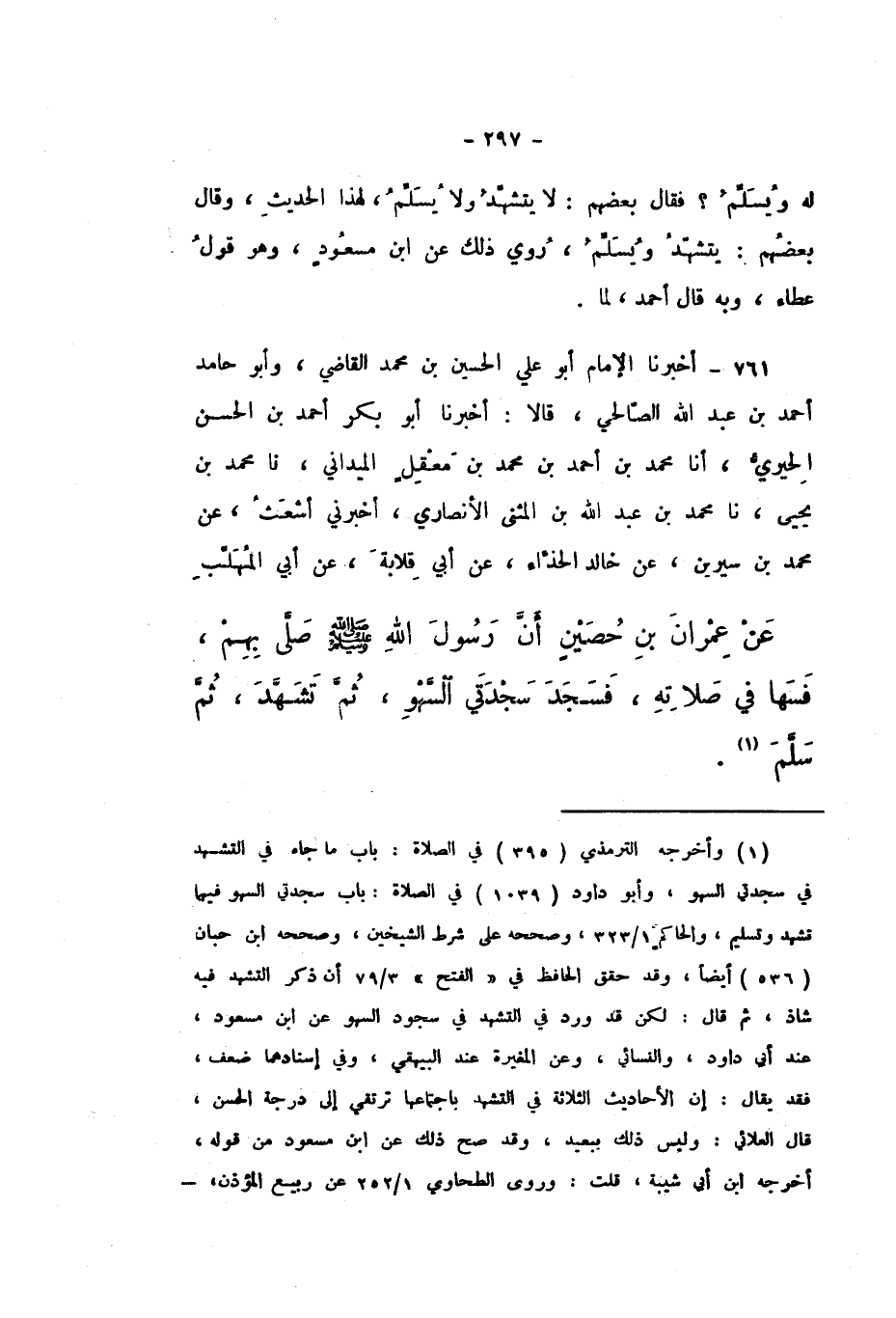 761 - أَخْبَرَنَا الإِمَامُ أَبُو عَلِيٍّ الْحُسَيْنُ بْنُ مُحَمَّدٍ الْقَاضِي، وَأَبُو حَامِدٍ أَحْمَدُ بْنُ عَبْدِ اللَّهِ الصَّالِحِيُّ، قَالا: أَخْبَرَنَا أَبُو بَكْرٍ أَحْمَدُ بْنُ الْحَسَنِ الْحِيرِيُّ، أَنَا مُحَمَّدُ بْنُ أَحْمَدَ بْنِ مُحَمَّدِ بْنِ مَعْقِلٍ الْمَيْدَانِيُّ، نَا مُحَمَّدُ بْنُ يَحْيَى، نَا مُحَمَّدُ بْنُ عَبْدِ اللَّهِ بْنِ الْمُثَنَّى الأَنْصَارِيُّ، أَخْبَرَنِي أَشْعَثُ، عَنْ مُحَمَّدِ بْنِ سِيرِينَ، عَنْ خَالِدٍ الْحَذَّاءِ، عَنْ أَبِي قِلابَةَ، عَنْ أَبِي الْمُهَلَّبِ، عَنْ عِمْرَانَ بْنِ حُصَيْنٍ، أَنَّ رَسُولَ اللَّهِ صَلَّى اللهُ عَلَيْهِ وَسَلَّمَ «صَلَّى بِهِمْ، فَسَهَا فِي صَلاتِهِ، فَسَجَدَ سَجْدَتَيِ السَّهْوِ، ثُمَّ تَشَهَّدَ، ثُمَّ سَلَّمَ».