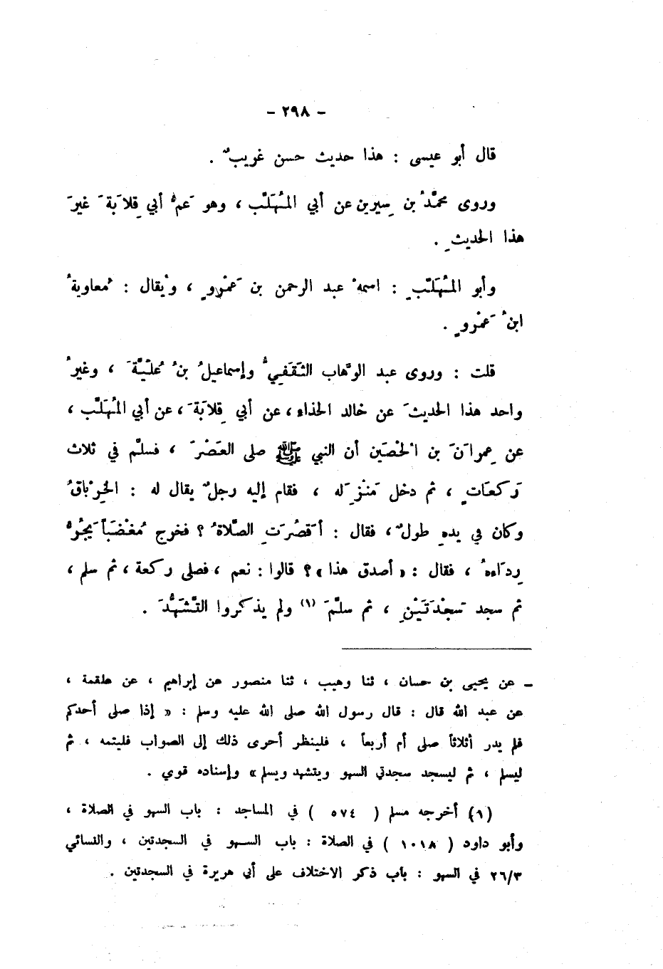 قُلْتُ: وَرَوَى عَبْدُ الْوَهَّابِ الثَّقَفِيُّ، وَإِسْمَاعِيلُ ابْنُ عُلَيَّةَ، وَغَيْرُ وَاحِدٍ هَذَا الْحَدِيثَ، عَنْ خَالِدٍ الْحَذَّاءِ، عَنْ أَبِي قِلابَةَ، عَنْ أَبِي الْمُهَلَّبِ، عَنْ عِمْرَانَ بْنِ الْحُصَيْنِ، أَنَّ النَّبِيَّ صَلَّى اللهُ عَلَيْهِ وَسَلَّمَ صَلَّى الْعَصْرَ، فَسَلَّمَ فِي ثَلاثِ رَكَعَاتٍ، ثُمَّ دَخَلَ مَنْزَلَهُ، فَقَامَ إِلَيْهِ رَجُلٌ يُقَالُ لَهُ: الْخِرْبَاقُ، وَكَانَ فِي يَدِهِ طُولٌ، فَقَالَ: أَقَصُرَتِ الصَّلاةُ؟ فَخَرَجَ مُغْضَبًا يَجُرُّ رِدَائَهُ، فَقَالَ: «أَصَدَقَ هَذَا»؟ قَالُوا: نَعَمْ.