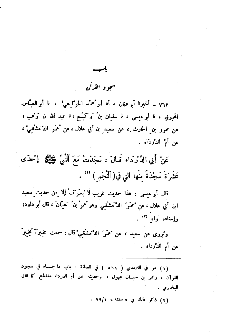 762 - أَخْبَرَنَا أَبُو عُثْمَانَ، أَنَا أَبُو مُحَمَّدٍ الْجَرَّاحِيُّ، نَا أَبُو الْعَبَّاسِ الْمَحْبُوبِيُّ، نَا أَبُو عِيسَى، نَا سُفْيَانُ بْنُ وَكِيعٍ، نَا عَبْدُ اللَّهِ بْنُ وَهْبٍ، عَنْ عَمْرِو بْنِ الْحَارِثِ، عَنْ سَعِيدِ بْنِ أَبِي هِلالٍ، عَنْ عُمَرَ الدِّمَشْقِيِّ، عَنْ أُمِّ الدَّرْدَاءِ، عَنْ أَبِي الدَّرْدَاءِ، قَالَ: «سَجَدْتُ مَعَ النَّبِيِّ صَلَّى اللهُ عَلَيْهِ وَسَلَّمَ إِحْدَى عَشْرَةَ سَجْدَةً مِنْهَا الَّتِي فِي النَّجْمِ».