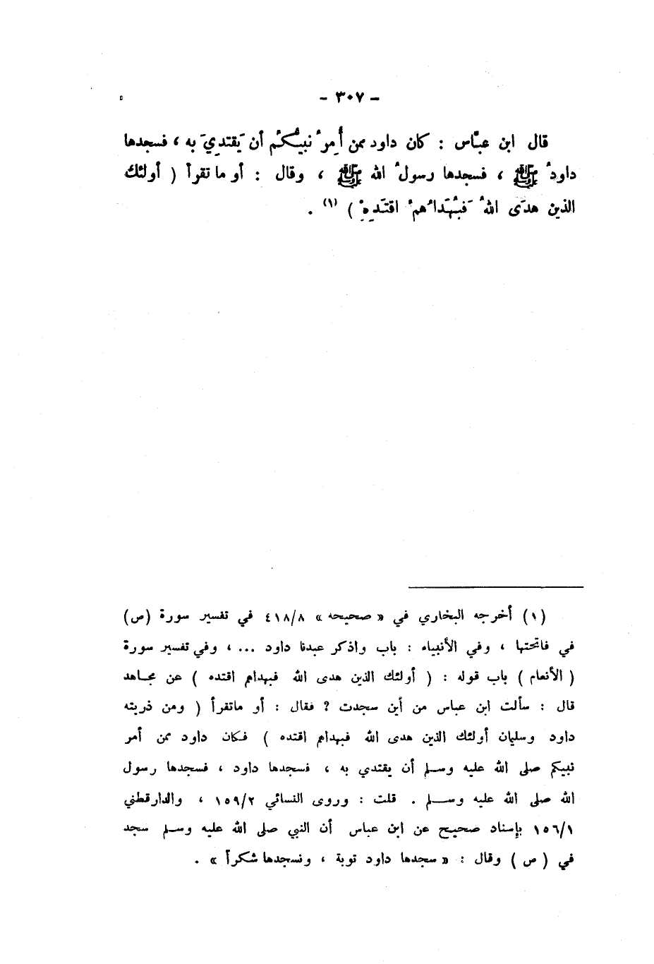 قَالَ ابْنُ عَبَّاسٍ: " كَانَ دَاوُدُ مِمَّنْ أُمِرَ نَبِيُّكُمْ أَنْ يَقْتَدِيَ بِهِ، فَسَجَدَهَا دَاوُدُ صَلَّى اللهُ عَلَيْهِ وَسَلَّمَ، فَسَجَدَهَا رَسُولُ اللَّهِ صَلَّى اللهُ عَلَيْهِ وَسَلَّمَ، وَقَالَ: أَوَمَا تَقْرَأُ {أُولَئِكَ الَّذِينَ هَدَى اللَّهُ فَبِهُدَاهُمُ اقْتَدِهْ} [الْأَنْعَام: 90] ".