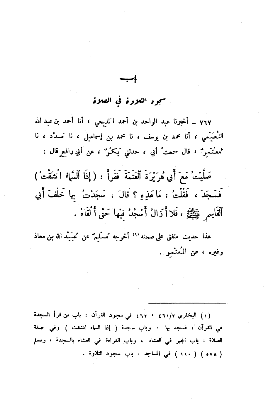 767 - أَخْبَرَنَا عَبْدُ الْوَاحِدِ بْنُ أَحْمَدَ الْمَلِيحِيُّ، أَنَا أَحْمَدُ بْنُ عَبْدِ اللَّهِ النُّعَيْمِيُّ، أَنَا مُحَمَّدُ بْنُ يُوسُفَ، نَا مُحَمَّدُ بْنُ إِسْمَاعِيلَ، نَا مُسَدَّدٌ، نَا مُعْتَمِرٌ، قَالَ سَمِعْتُ أَبِي، حَدَّثَنِي بَكْرٌ، عَنْ أَبِي رَافِعٍ، قَالَ: صَلَّيْتُ مَعَ أَبِي هُرَيْرَةَ الْعَتَمَةَ فَقَرَأَ: " إِذَا السَّمَاءُ انْشَقَّتْ فَسَجَدَ، فَقُلْتُ: مَا هَذِهِ؟ قَالَ: سَجَدْتُ بِهَا خَلْفَ أَبِي الْقَاسِمِ صَلَّى اللهُ عَلَيْهِ وَسَلَّمَ، فَلا أَزَالُ أَسْجُدُ فِيهَا حَتَّى أَلْقَاهُ ".