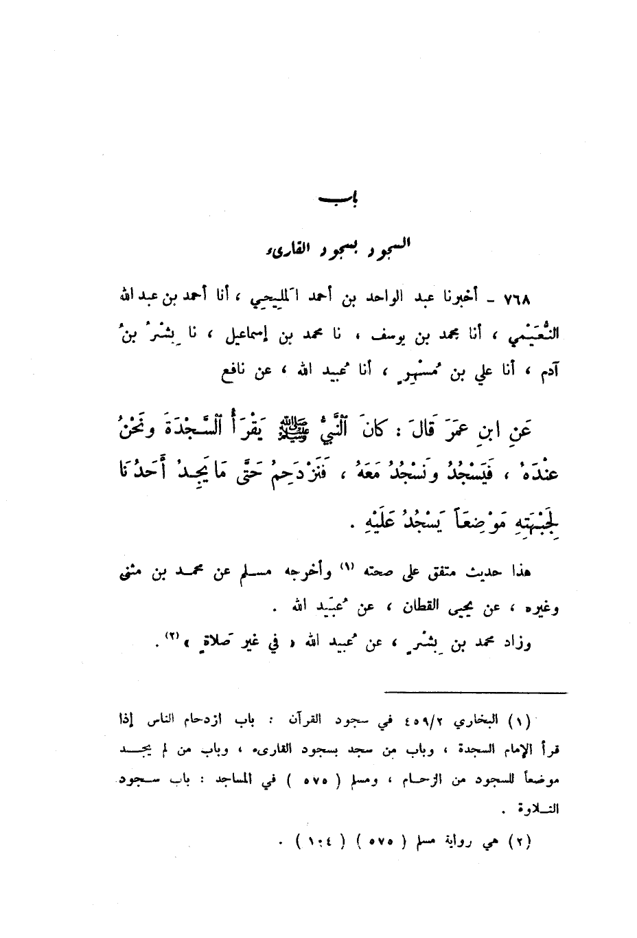 768 - أَخْبَرَنَا عَبْدُ الْوَاحِدِ بْنُ أَحْمَدَ الْمَلِيحِيُّ، أَنَا أَحْمَدُ بْنُ عَبْدِ اللَّهِ النُّعَيْمِيُّ، أَنَا مُحَمَّدُ بْنُ يُوسُفَ، نَا مُحَمَّدُ بْنُ إِسْمَاعِيلَ، نَا بِشْرُ بْنُ آدَمَ، أَنَا عَلِيُّ بْنُ مُسْهِرٍ، أَنَا عُبَيْدُ اللَّهِ، عَنْ نَافِعٍ، عَنِ ابْنِ عُمَرَ، قَالَ: كَانَ النَّبِيُّ صَلَّى اللهُ عَلَيْهِ وَسَلَّمَ «يَقْرَأُ السَّجْدَةَ وَنَحْنُ عِنْدَهُ، فَيَسْجُدُ وَنَسْجُدُ مَعَهُ، فَنَزْدَحِمُ حَتَّى مَا يَجِدُ أَحَدُنَا لِجَبْهَتِهِ مَوْضِعًا يَسْجُدُ عَلَيْهِ».