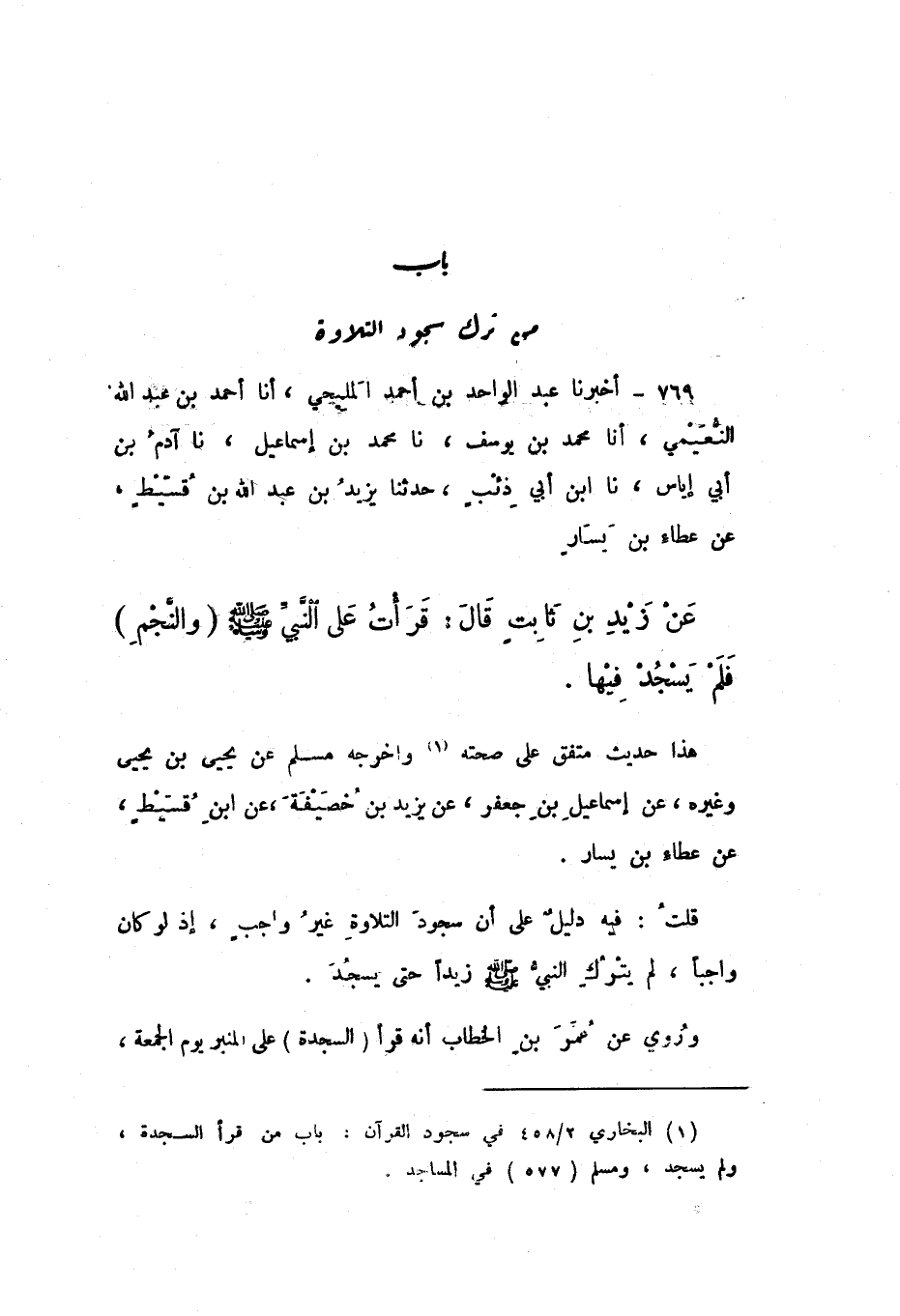 769 - أَخْبَرَنَا عَبْدُ الْوَاحِدِ بْنُ أَحْمَدَ الْمَلِيحِيُّ، أَنَا أَحْمَدُ بْنُ عَبْدِ اللَّهِ النُّعَيْمِيُّ، أَنَا مُحَمَّدُ بْنُ يُوسُفَ، نَا مُحَمَّدُ بْنُ إِسْمَاعِيلَ، نَا آدَمُ بْنُ أَبِي إِيَاسٍ، نَا ابْنُ أَبِي ذِئْبٍ، حَدَّثَنَا يَزِيدُ بْنُ عَبْدِ اللَّهِ بْنِ قُسَيْطٍ، عَنْ عَطَاءِ بْنِ يَسَارٍ، عَنْ زَيْدِ بْنِ ثَابِتٍ، قَالَ: «قَرَأْتُ عَلَى النَّبِيِّ صَلَّى اللهُ عَلَيْهِ وَسَلَّمَ وَالنَّجْمِ فَلَمْ يَسْجُدْ فِيهَا».