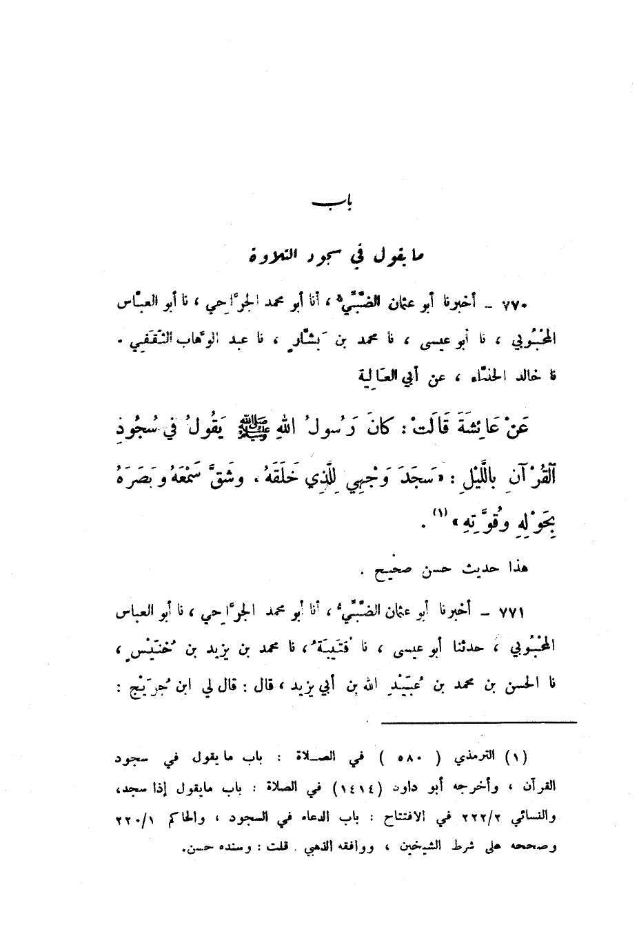 770 - أَخْبَرَنَا أَبُو عُثْمَانَ الضَّبِّيُّ، أَنَا أَبُو مُحَمَّدٍ الْجَرَّاحِيُّ، نَا أَبُو الْعَبَّاسِ الْمَحْبُوبِيُّ، نَا أَبُو عِيسَى، نَا مُحَمَّدُ بْنُ بَشَّارٍ، نَا عَبْدُ الْوَهَّابِ الثَّقَفِيُّ، نَا خَالِدٌ الْحَذَّاءُ، عَنْ أَبِي الْعَالِيَةِ، عَنْ عَائِشَةَ، قَالَتْ: كَانَ رَسُولُ اللَّهِ صَلَّى اللهُ عَلَيْهِ وَسَلَّمَ، يَقُولُ فِي سُجُودِ الْقُرْآنِ بِاللَّيْلِ: «سَجَدَ وَجْهِي لِلَّذِي خَلَقَهُ، وَشَقَّ سَمْعَهُ وَبَصَرَهُ، بِحَوْلِهِ وَقُوَّتِهِ».