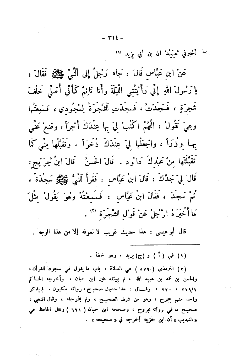 أَخْبَرَنِي عُبَيْدُ اللَّهِ بْنُ أَبِي يَزِيدَ، عَنِ ابْنِ عَبَّاسٍ، قَالَ: " جَاءَ رَجُلٌ إِلَى النَّبِيِّ صَلَّى اللهُ عَلَيْهِ وَسَلَّمَ، فَقَالَ: يَا رَسُولَ اللَّهِ، إِنِّي رَأَيْتُنِي اللَّيْلَةَ وَأَنَا نَائِمٌ كَأَنِّي أُصَلِّي خَلْفَ شَجَرَةٍ، فَسَجَدْتُ، فَسَجَدَتِ الشَّجَرَةُ لِسُجُودِي، فَسَمِعْتُهَا وَهِيَ تَقُولُ: اللَّهُمَّ اكْتُبْ لِي بِهَا عِنْدَكَ أَجْرًا، وَضَعْ عَنِّي بِهَا وِزْرًا، وَاجْعَلْهَا لِي عِنْدَكَ ذُخْرًا، وَتَقَبَّلْهَا مِنِّي كَمَا تَقَبَّلْتَهَا مِنْ عَبْدِكَ دَاوُدَ.