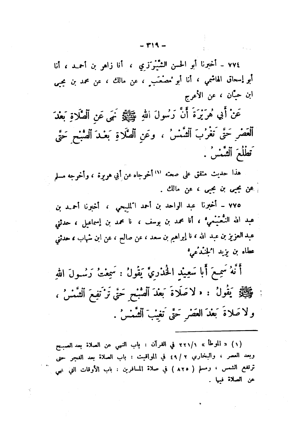 774 - أَخْبَرَنَا أَبُو الْحَسَنِ الشِّيرَزِيُّ، أَنَا زَاهِرُ بْنُ أَحْمَدَ، أَنَا أَبُو إِسْحَاقَ الْهَاشِمِيُّ، أَنا أَبُو مُصْعَبٍ، عَنْ مَالِكٍ، عَنْ مُحَمَّدِ بْنِ يَحْيَى بْنِ حَيَّانَ، عَنِ الأَعْرَجِ، عَنْ أَبِي هُرَيْرَةَ، أَنَّ رَسُولَ اللَّهِ صَلَّى اللهُ عَلَيْهِ وَسَلَّمَ «نَهَى عَنِ الصَّلاةِ بَعْدَ الْعَصْرِ حَتَّى تَغْرُبَ الشَّمْسُ، وَعَنِ الصَّلاةِ بَعْدَ الصُّبْحِ حَتَّى تَطْلُعَ الشَّمْسُ».