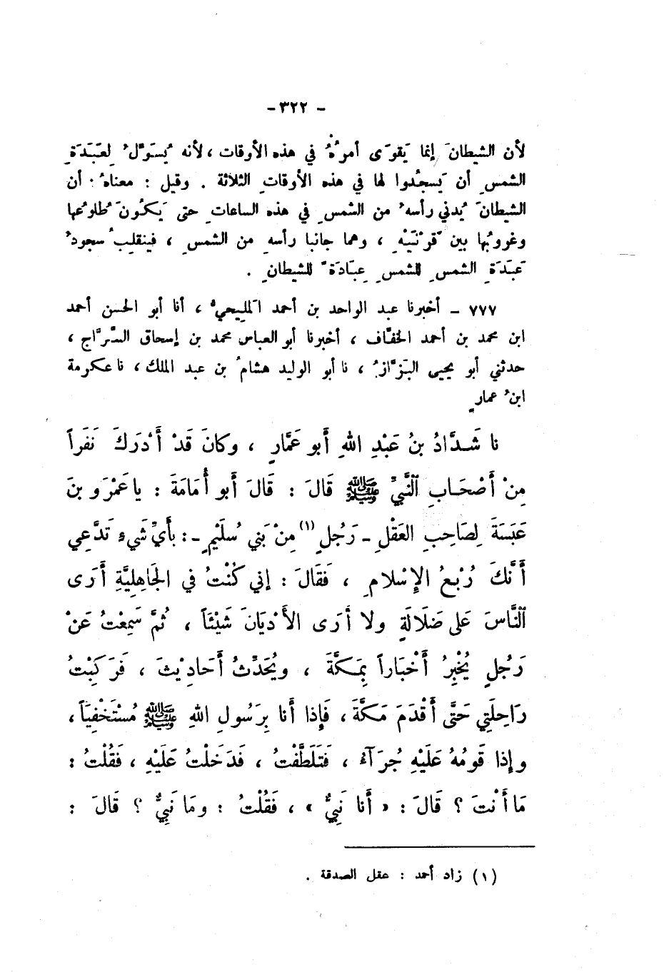 777 - أَخْبَرَنَا عَبْدُ الْوَاحِدِ بْنُ أَحْمَدَ الْمَلِيحِيُّ، أَنَا أَبُو الْحَسَنِ أَحْمَدُ بْنُ مُحَمَّدِ بْنِ أَحْمَدَ الْخَفَّافُ، أَخْبَرَنَا أَبُو الْعَبَّاسِ مُحَمَّدُ بْنُ إِسْحَاقَ السَّرَّاجُ، حَدَّثَنِي أَبُو يَحْيَى الْبَزَّازُ، نَا أَبُو الْوَلِيدِ هِشَامُ بْنُ عَبْدِ الْمَلِكِ، نَا عِكْرِمَةُ بْنُ عَمَّارٍ، نَا شَدَّادُ بْنُ عَبْدِ اللَّهِ أَبُو عَمَّارٍ، وَكَانَ قَدْ أَدْرَكَ نَفَرًا مِنْ أَصْحَابِ النَّبِيِّ صَلَّى اللهُ عَلَيْهِ وَسَلَّمَ، قَالَ: قَالَ أَبُو أُمَامَةَ: يَا عَمْرُو بْنَ عَبَسَةَ لِصَاحِبِ الْعَقْلِ، رَجُلٍ مِنْ بَنِي سُلَيْمٍ، بِأَيِّ شَيْءٍ تَدَّعِي أَنَّكَ رُبْعُ الإِسْلامِ، فَقَالَ: إِنِّي كُنْتُ فِي الْجَاهِلِيَّةِ أَرَى النَّاسَ عَلَى ضَلالَةٍ، وَلا أَرَى الأَدْيَانَ شَيْئًا، ثُمَّ سَمِعْتُ عَنْ رَجُلٍ يخبر أَخْبَارًا بِمَكَّةَ، وَيُحَدِّثُ أَحَادِيثَ، فَرَكِبْتُ رَاحِلَتِي حَتَّى أَقْدَمَ مَكَّةَ، فَإِذَا أَنَا بِرَسُولِ اللَّهِ صَلَّى اللهُ عَلَيْهِ وَسَلَّمَ مُسْتَخْفِيًا، وَإِذَا قَوْمُهُ عَلَيْهِ جُرَآءُ، فَتَلَطَّفْتُ، فَدَخَلْتُ عَلَيْهِ، فَقُلْتُ: مَا أَنْتَ؟ قَالَ: «أَنَا نَبِيٌّ»، فَقُلْتُ: وَمَا نَبِيٌّ؟ قَالَ: «