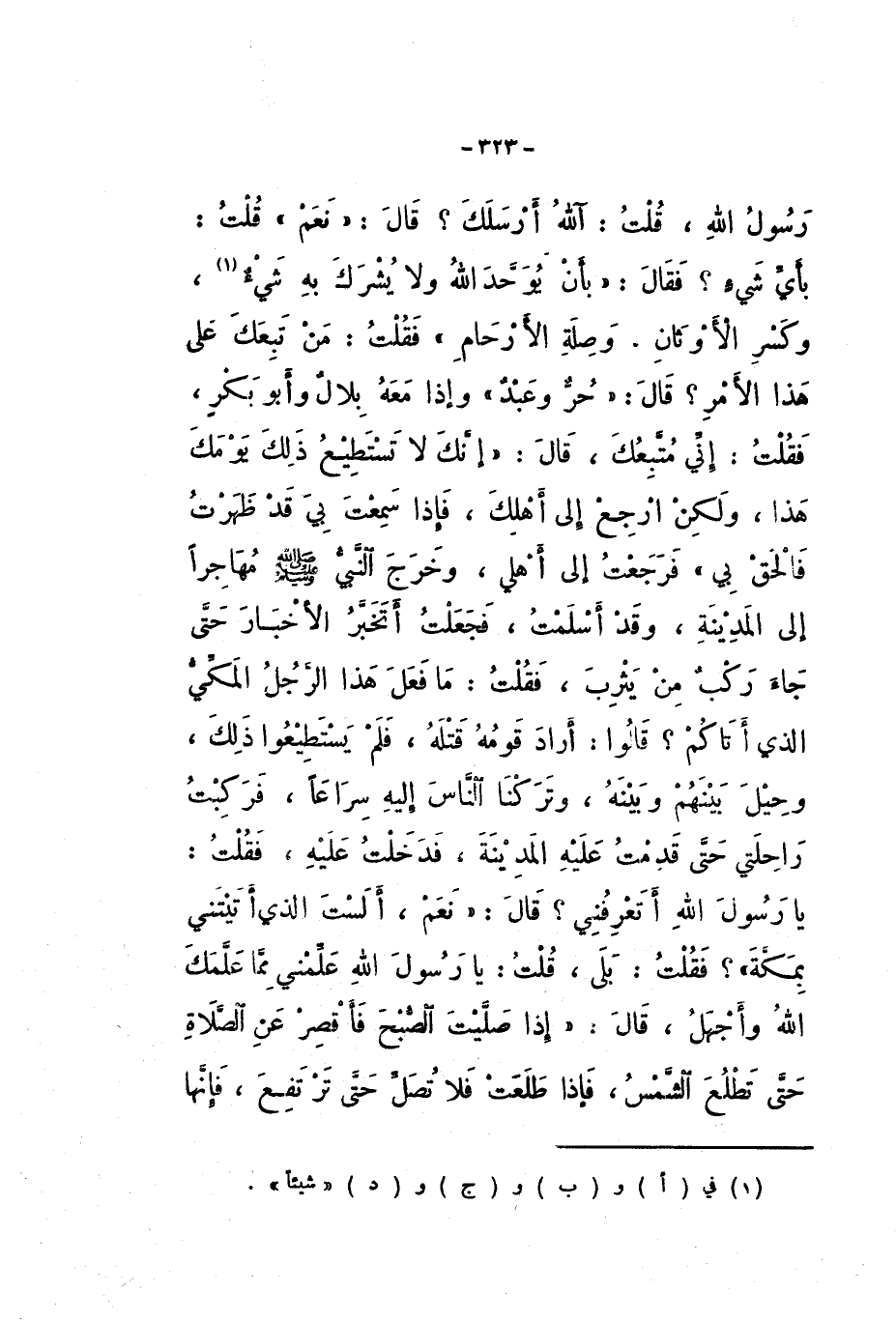رَسُولُ اللَّهِ»، قُلْتُ: آللَّهُ أَرْسَلَكَ؟ قَالَ: «نَعَمْ»، قُلْتُ: بِأَيِّ شَيْءٍ؟ فَقَالَ: «بِأَنْ يُوَحَّدَ اللَّهُ وَلا يُشْرَكَ بِهِ شَيْءٌ، وَكَسْرِ الأَوْثَانِ، وَصِلَةِ الأَرْحَامِ» فَقُلْتُ: مَنْ تَبِعَكَ عَلَى هَذَا الأَمْرِ؟ قَالَ: «حُرٌّ وَعَبْدٌ» وَإِذَا مَعَهُ بِلالٌ وَأَبُو بَكْرٍ، فَقُلْتُ: إِنِّي مُتَّبِعُكَ، قَالَ: «إِنَّكَ لَا تَسْتَطِيعُ ذَلِكَ يَوْمَكَ هَذَا، وَلَكِنِ ارْجِعْ إِلَى أَهْلِكَ، فَإِذَا سَمِعْتَ بِي قَدْ ظَهَرْتُ فَالْحَقْ بِي» فَرَجَعْتُ إِلَى أَهْلِي، وَخَرَجَ النَّبِيُّ صَلَّى اللهُ عَلَيْهِ وَسَلَّمَ مُهَاجِرًا إِلَى الْمَدِينَةِ، وَقَدْ أَسْلَمْتُ، فَجَعَلْتُ أَتَخَبَّرُ الأَخْبَارَ حَتَّى جَاءَ رَكْبٌ مِنْ يَثْرِبَ، فَقُلْتُ: مَا فَعَلَ هَذَا الرَّجُلُ الْمَكِّيُّ الَّذِي أَتَاكُمْ؟ قَالُوا: أَرَادَ قَوْمُهُ قَتْلَهُ، فَلَمْ يَسْتَطِيعُوا ذَلِكَ، وَحِيلَ بَيْنَهُمْ وَبَيْنَهُ، وَتَرَكْنَا النَّاسَ إِلَيْهِ سِرَاعًا، فَرَكِبْتُ رَاحِلَتِي حَتَّى قَدِمْتُ عَلَيْهِ الْمَدِينَةَ، فَدَخَلْتُ عَلَيْهِ، فَقُلْتُ: يَا رَسُولَ اللَّهِ، أَتَعْرِفُنِي؟ قَالَ: «نَعَمْ، أَلَسْتَ الَّذِي أَتَيْتَنِي بِمَكَّةَ»؟ فَقُلْتُ: بَلَى، قُلْتُ: يَا رَسُولَ اللَّهِ، عَلِّمْنِي مِمَّا عَلَّمَكَ اللَّهُ وَأَجْهَلُ، قَالَ: «إِذَا صَلَّيْتَ الصُّبْحَ فَأَقْصِرْ عَنِ الصَّلاةِ حَتَّى تَطْلُعَ الشَّمْسُ، فَإِذَا طَلَعَتْ فَلا تُصَلِّ حَتَّى تَرْتَفِعَ، فَإِنَّهَا