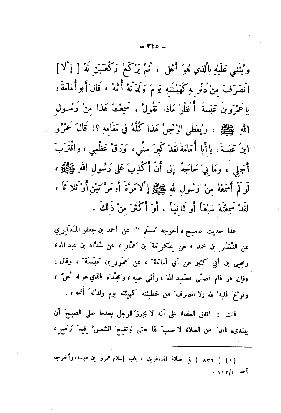 وَيُثْنِي عَلَيْهِ بِالَّذِي هُوَ أَهْلٌ، ثُمَّ يَرْكَعُ رَكْعَتَيْنِ لَهُ إِلا انْصَرَفَ مِنْ ذُنُوبِهِ كَهَيْئَتِهِ يَوْمَ وَلَدَتْهُ أُمُّهُ»، قَالَ أَبُو أُمَامَةَ: يَا عَمْرُو بْنَ عَبَسَةَ، انْظُرْ مَاذَا تَقُولُ؟ سَمِعْتُ هَذَا مِنْ رَسُولِ اللَّهِ صَلَّى اللهُ عَلَيْهِ وَسَلَّمَ، وَيُعْطَى الرَّجُلُ هَذَا كُلَّهُ فِي مَقَامِهِ؟! قَالَ عَمْرُو بْنُ عَبَسَةِ: يَا أَبَا أُمَامَةَ، لَقَدْ كَبِرَ سِنِّي، وَرَقَّ عَظْمِي، وَاقْتَرَبَ أَجَلِي، وَمَا بِي حَاجَةٌ إِلَى أَنْ أَكْذِبَ عَلَى رَسُولِ اللَّهِ صَلَّى اللهُ عَلَيْهِ وَسَلَّمَ، لَوْ لَمْ أَسْمَعْهُ مِنْ رَسُولِ اللَّهِ صَلَّى اللهُ عَلَيْهِ وَسَلَّمَ إِلا مَرَّةً، أَوْ مَرَّتَيْنِ، أَوْ ثَلاثًا، لَقَدْ سَمِعْتُهُ سَبْعًا، أَوْ ثَمَانِيًا، أَوْ أَكْثَرَ مِنْ ذَلِكَ.