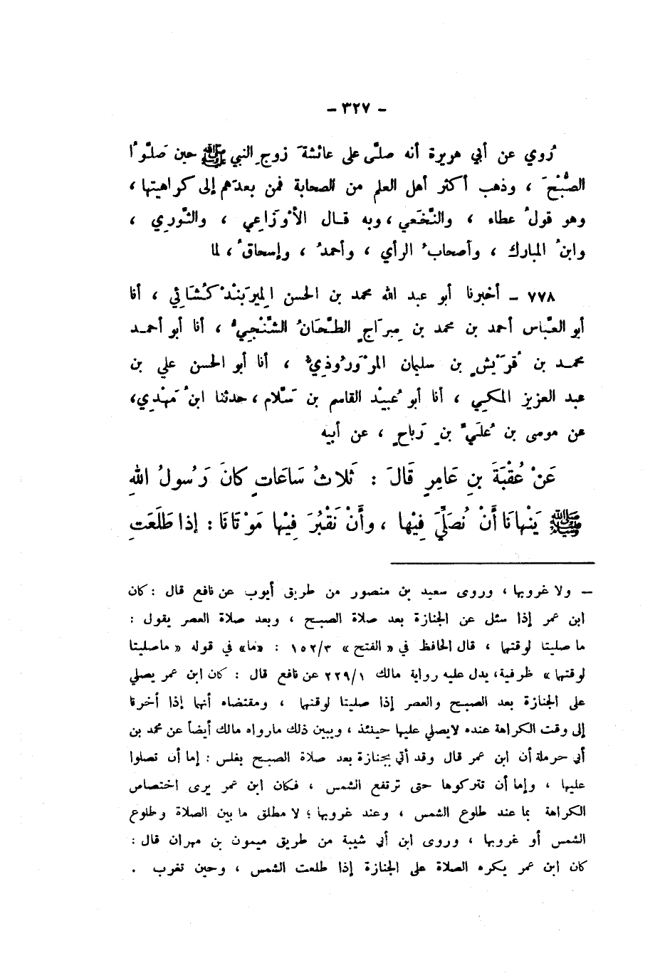 778 - أَخْبَرَنَا أَبُو عَبْدِ اللَّهِ مُحَمَّدُ بْنُ الْحَسَنِ الميربندكشائِيُّ، أَنَا أَبُو الْعَبَّاسِ أَحْمَدُ بْنُ مُحَمَّدِ بْنِ سِرَاجٍ الطَّحَّانُ الشِّنْجِيُّ، أَنَا أَبُو أَحْمَدَ مُحَمَّدُ بْنُ قُرَيْشِ بْنِ سُلَيْمَانَ الْمَرْوَرَوذِيُّ، أَنا أَبُو الْحَسَنِ عَلِيُّ بْنُ عَبْدِ الْعَزِيزِ الْمَكِّيُّ، أَنَا أَبُو عُبَيْدٍ الْقَاسِمُ بْنُ سَلامٍ، حَدَّثَنَا ابْنُ مَهْدِيٍّ، عَنْ مُوسَى بْنِ عَلِيِّ بْنِ رَبَاحٍ، عَنْ أَبِيهِ، عَنْ عُقْبَةَ بْنِ عَامِرٍ، قَالَ: ثَلاثُ سَاعَاتٍ كَانَ رَسُولُ اللَّهِ صَلَّى اللهُ عَلَيْهِ وَسَلَّمَ يَنْهَانَا أَنْ نُصَلِّيَ فِيهَا، وَأَنْ نَقْبُرَ فِيهَا مَوْتَانَا: «إِذَا طَلَعَتِ