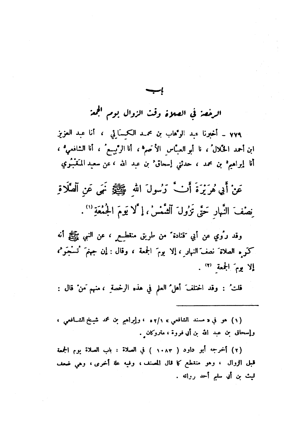 779 - أَخْبَرَنَا عَبْدُ الْوَهَّابِ بْنُ مُحَمَّدٍ الْكِسَائِيُّ، أَنَا عَبْدُ الْعَزِيزِ بْنُ أَحْمَدَ الْخَلالُ، نَا أَبُو الْعَبَّاسِ الأَصَمُّ، أَنَا الرَّبِيعُ، أَنَا الشَّافِعِيُّ، أَنَا إِبْرَاهِيمُ بْنُ مُحَمَّدٍ، حَدَّثَنِي إِسْحَاقُ بْنُ عَبْدِ اللَّهِ، عَنْ سَعِيدٍ الْمَقْبُرِيِّ، عَنْ أَبِي هُرَيْرَةَ، أَنَّ رَسُولَ اللَّهِ صَلَّى اللهُ عَلَيْهِ وَسَلَّمَ «نَهَى عَنِ الصَّلاةِ نِصْفَ النَّهَارِ حَتَّى تَزُولَ الشَّمْسُ، إِلا يَوْمَ الْجُمُعَةِ».