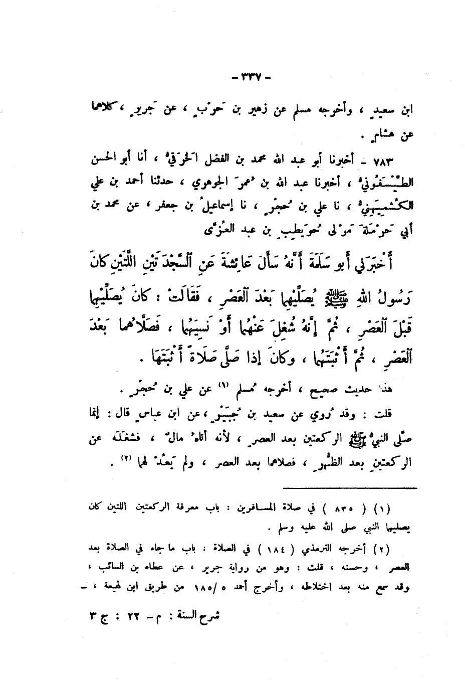 783 - أَخْبَرَنَا أَبُو عَبْدِ اللَّهِ مُحَمَّدُ بْنُ الْفَضْلِ الْخَرَقِيُّ، أَنَا أَبُو الْحَسَنِ الطَّيْسَفُونِيُّ، أَخْبَرَنَا عَبْدُ اللَّهِ بْنُ عُمَرَ الْجَوْهَرِيُّ، حَدَّثَنَا أَحْمَدُ بْنُ عَلِيٍّ الْكُشْمِيهَنِيُّ، نَا عَلِيُّ بْنُ حُجْرٍ، نَا إِسْمَاعِيلُ بْنُ جَعْفَرٍ، عَنْ مُحَمَّدِ بْنِ أَبِي حَرْمَلَةَ، مَوْلَى حُوَيْطِبِ بْنِ عَبْدِ الْعُزَّى، أَخْبَرَنِي أَبُو سَلَمَةَ، أَنَّهُ سَأَلَ عَائِشَةَ عَنِ السَّجْدَتَيْنِ اللَّتَيْنِ كَانَ رَسُولُ اللَّهِ صَلَّى اللهُ عَلَيْهِ وَسَلَّمَ يُصَلِّيهِمَا بَعْدَ الْعَصْرِ، فَقَالَتْ: «كَانَ يُصَلِّيهِمَا قَبْلَ الْعَصْرِ، ثُمَّ إِنَّهُ شُغِلَ عَنْهُمَا، أَوْ نَسِيَهُمَا، فَصَلاهُمَا بَعْدَ الْعَصْرِ، ثُمَّ أَثْبَتَهُمَا، وَكَانَ إِذَا صَلَّى صَلاةً أَثْبَتَهَا».