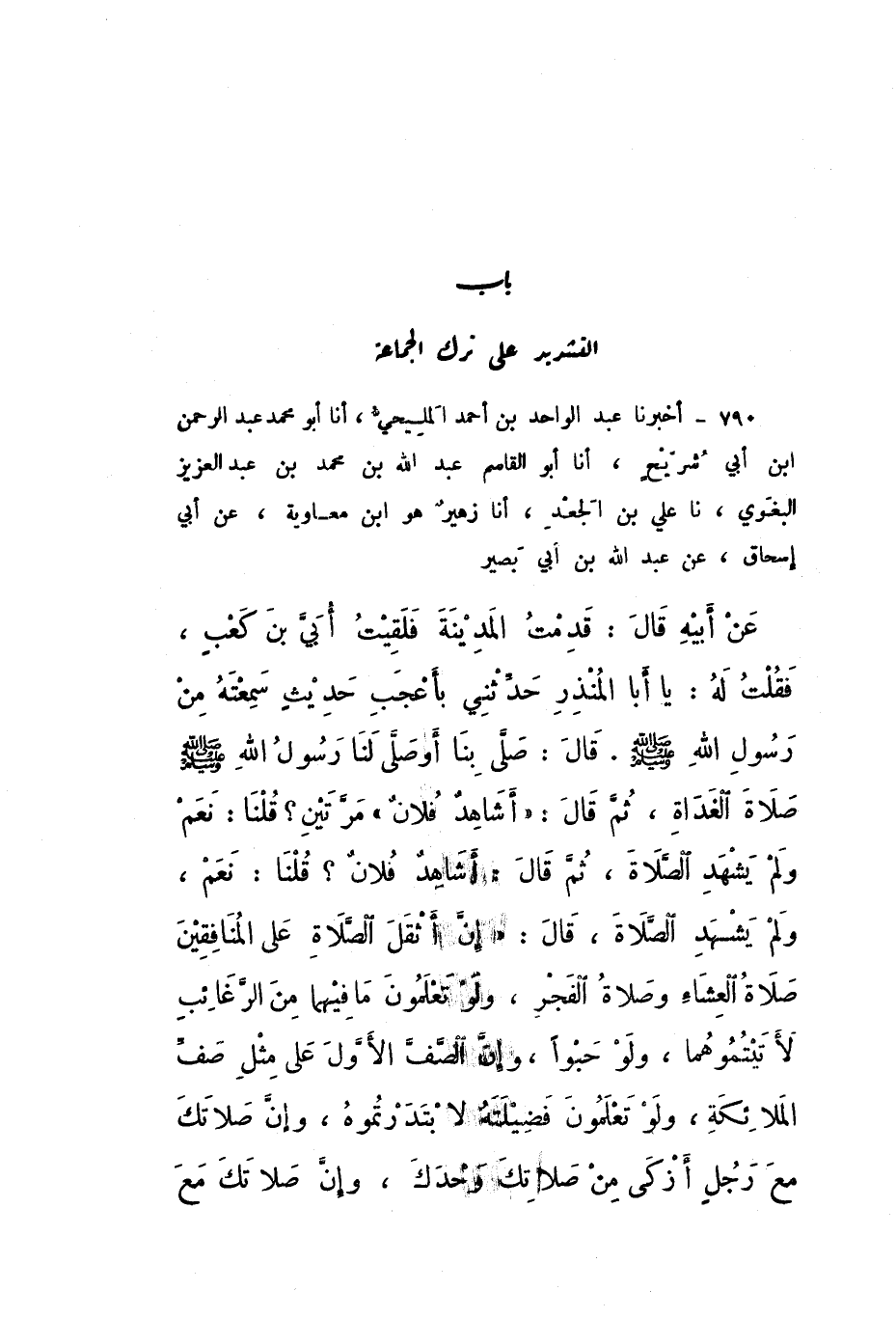 قَالَ: صَلَّى بِنَا، أَوْ صَلَّى لَنَا رَسُولُ اللَّهِ صَلَّى اللهُ عَلَيْهِ وَسَلَّمَ صَلاةَ الْغَدَاةِ، ثُمَّ قَالَ: «أَشَاهِدٌ فُلانٌ» مَرَّتَيْنِ؟ قُلْنَا: نَعَمْ، وَلَمْ يَشْهَدِ الصَّلاةِ، ثُمَّ قَالَ: «أَشَاهِدٌ فُلانٌ؟» قُلْنَا: نَعَمْ، وَلَمْ يَشْهَدِ الصَّلاةَ، قَالَ: «إِنَّ أَثْقَلَ الصَّلاةِ عَلَى الْمُنَافِقِينَ صَلاةُ الْعِشَاءِ، وَصَلاةُ الْفَجْرِ، وَلَوْ تَعْلَمُونَ مَا فِيهِمَا مِنَ الرَّغَائِبِ لأَتَيْتُمُوهُمَا، وَلَوْ حَبْوًا، وَإِنَّ الصَّفَّ الأَوَّلَ عَلَى مِثْلِ صَفِّ الْمَلائِكَةِ، وَلَوْ تَعْلَمُونَ فَضِيلَتَهُ لابْتَدَرْتُمُوهُ، وَإِنَّ صَلاتَكَ مَعَ رَجُلٍ أَزْكَى مِنْ صَلاتِكَ وَحْدَكَ، وَإِنَّ صَلاتَكَ مَعَ