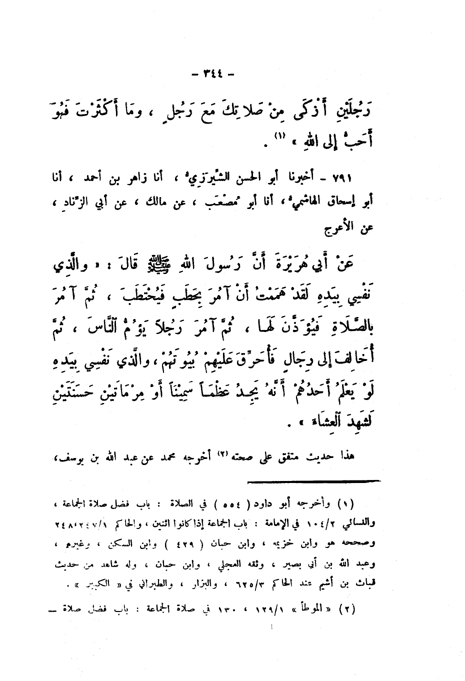 791 - أَخْبَرَنَا أَبُو الْحَسَنِ الشِّيرَزِيُّ، أَنَا زَاهِرُ بْنُ أَحْمَدَ، أَنَا أَبُو إِسْحَاقَ الْهَاشِمِيُّ، أَنَا أَبُو مُصْعَبٍ، عَنْ مَالِكٍ، عَنْ أَبِي الزِّنَادِ، عَنِ الأَعْرَجِ، عَنْ أَبِي هُرَيْرَةَ، أَنَّ رَسُولَ اللَّهِ صَلَّى اللهُ عَلَيْهِ وَسَلَّمَ، قَالَ: «وَالَّذِي نَفْسِي بِيَدِهِ، لَقَدْ هَمَمْتُ أَنْ آمُرَ بِحَطَبٍ فَيُحْتَطَبَ، ثُمَّ آمُرَ بِالصَّلاةِ فَيُؤَذَّنَ لَهَا، ثُمَّ آمُرَ رَجُلا يَؤُمُّ النَّاسَ، ثُمَّ أُخَالِفَ إِلَى رِجَالٍ فَأُحَرِّقَ عَلَيْهِمْ بُيُوتَهُمْ، وَالَّذِي نَفْسِي بِيَدِهِ، لَوْ يَعْلَمُ أَحَدُهُمْ أَنَّهُ يَجِدُ عَظْمًا سَمِينًا، أَوْ مِرْمَاتَيْنِ حَسَنَتَيْنِ لَشَهِدَ الْعِشَاءَ».