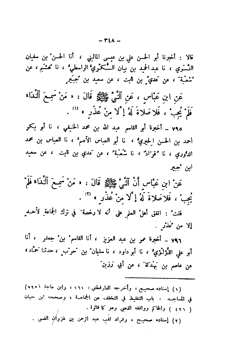 قَالا: أَخْبَرَنَا أَبُو الْحَسَنِ عَلِيُّ بْنُ عِيسَى الْمَالِينِيُّ، أَنَا الْحَسَنُ بْنُ سُفْيَانَ النَّسَوِيُّ، نَا عَبْدُ الْحَمِيدِ بْنُ بَيَانٍ السُّكَّرِيُّ الْوَاسِطِيُّ، نَا هُشَيْمٌ، عَنْ شُعْبَةَ، عَنْ عَدِيِّ بْنِ ثَابِتٍ، عَنْ سَعِيدِ بْنِ جُبَيْرٍ، عَنِ ابْنِ عَبَّاسٍ، عَنِ النَّبِيِّ صَلَّى اللهُ عَلَيْهِ وَسَلَّمَ، قَالَ: «مَنْ سَمِعَ النِّدَاءَ فَلَمْ يُجِبْ، فَلا صَلاةَ لَهُ إِلا مِنْ عُذْرٍ»