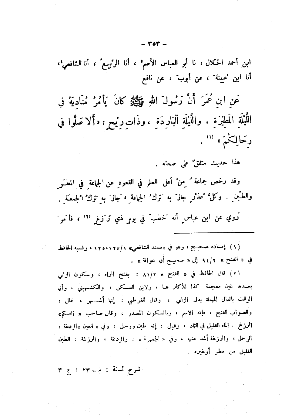 بْنُ أَحْمَدَ الْخَلالُ، نَا أَبُو الْعَبَّاسِ الأَصَمُّ، أَنَا الرَّبِيعُ، أَنا الشَّافِعِيُّ، أَنَا ابْنُ عُيَيْنَةَ، عَنْ أَيُّوبَ، عَنْ نَافِعٍ، عَنِ ابْنِ عُمَرَ، أَنَّ رَسُولَ اللَّهِ صَلَّى اللهُ عَلَيْهِ وَسَلَّمَ كَانَ " يَأْمُرُ مُنَادِيهِ فِي اللَّيْلَةِ الْمَطِيرَةِ، وَاللَّيْلَةِ الْبَارِدَةِ، وَذَاتِ رِيحٍ: أَلا صَلُّوا فِي رِحَالِكُمْ «.