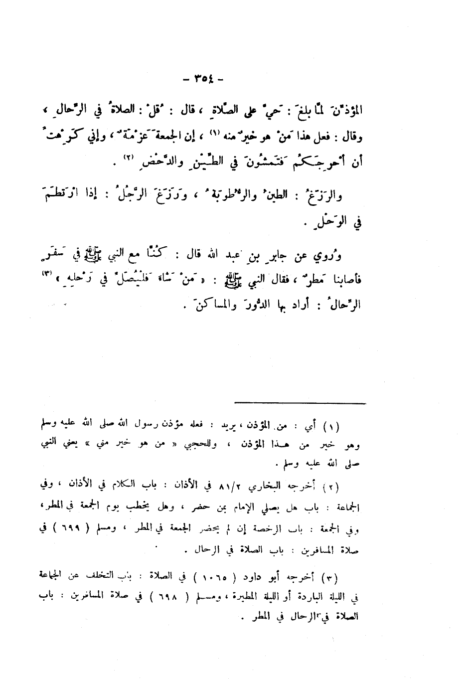 الْمُؤَذِّنَ لَمَّا بَلَغَ: حَيَّ عَلَى الصَّلاةِ، قَالَ: قُلِ الصَّلاةُ فِي الرِّحَالِ، وَقَالَ: فَعَلَ هَذَا مَنْ هُوَ خَيْرٌ مِنْهُ، إِنَّ الْجُمُعَةَ عَزْمَةٌ، وَإِنِّي كَرِهْتُ أَنْ أُحْرِجَكُمْ فَتَمْشُونَ فِي الطِّينِ وَالدَّحْضِ ".