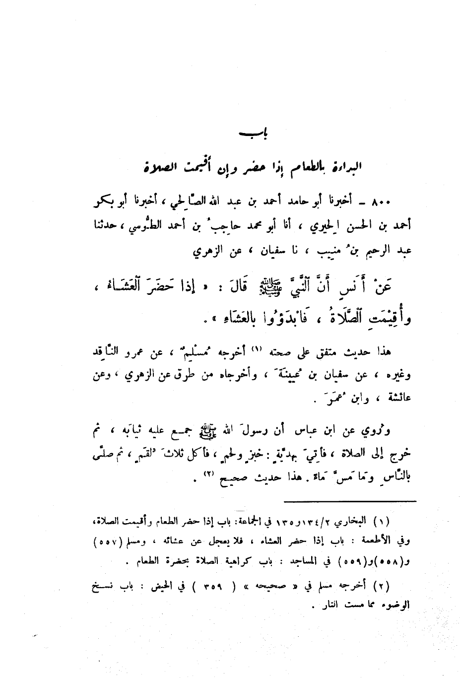 800 - أَخْبَرَنَا أَبُو حَامِدٍ أَحْمَدُ بْنُ عَبْدِ اللَّهِ الصَّالِحِيُّ، أَخْبَرَنَا أَبُو بَكْرٍ أَحْمَدُ بْنُ الْحَسَنِ الْحِيرِيُّ، أَنَا أَبُو مُحَمَّدٍ حَاجِبُ بْنُ أَحْمَدَ الطُّوسِيُّ، حَدَّثَنَا عَبْدُ الرَّحِيمِ بْنُ مُنِيبٍ، نَا سُفْيَانُ، عَنِ الزُّهْرِيِّ، عَنْ أَنَسٍ، أَنَّ النَّبِيَّ صَلَّى اللهُ عَلَيْهِ وَسَلَّمَ، قَالَ: «إِذَا حَضَرَ الْعَشَاءُ، وَأُقِيمَتِ الصَّلاةُ، فَابْدَءُوا بِالْعَشَاءِ».
