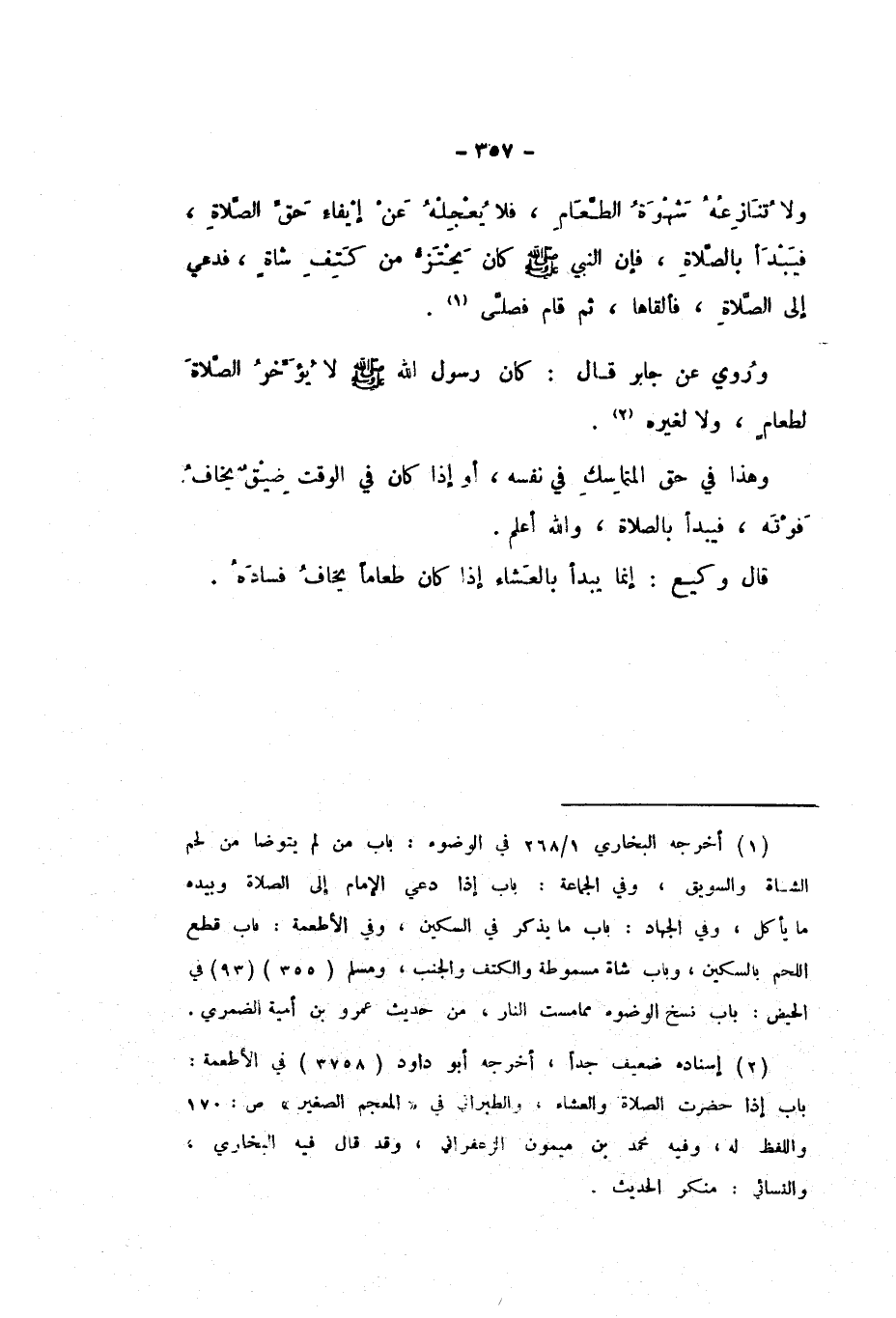 وَلا تُنَازِعُهُ شَهْوَةُ الطَّعَامِ، فَلا يُعْجِلْهُ عَنْ إِيفَاءِ حَقِّ الصَّلاةِ، فَيَبْدَأُ بِالصَّلاةِ، فَإِنَّ النَّبِيَّ صَلَّى اللهُ عَلَيْهِ وَسَلَّمَ، «كَانَ يَحْتَزُّ مِنْ كَتِفِ شَاةٍ، فَدُعِيَ إِلَى الصَّلاةِ، فَأَلْقَاهَا، ثُمَّ قَامَ فَصَلَّى».
