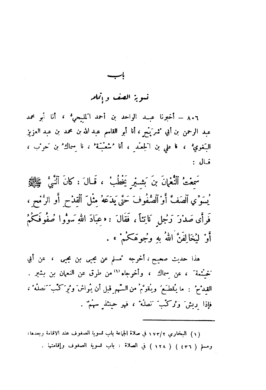 806 - أَخْبَرَنَا عَبْدُ الْوَاحِدِ بْنُ أَحْمَدَ الْمَلِيحِيُّ، أَنَا أَبُو مُحَمَّدٍ عَبْدُ الرَّحْمَنِ بْنُ أَبِي شُرَيْحٍ، أَنَا أَبُو الْقَاسِمِ عَبْدُ اللَّهِ بْنُ مُحَمَّدِ بْنِ عَبْدِ الْعَزِيزِ الْبَغَوِيُّ، نَا عَلِيُّ بْنُ الْجَعْدِ، أَنَا شُعْبَةُ، نَا سِمَاكُ بْنُ حَرْبٍ، قَالَ: سَمِعْتُ النُّعْمَانَ بْنَ بَشِيرٍ يَخْطُبُ، قَالَ: كَانَ النَّبِيُّ صَلَّى اللهُ عَلَيْهِ وَسَلَّمَ يُسَوِّي الْصَفَّ، أَوِ الصُّفُوفَ حَتَّى يَدَعَهُ مِثْلَ الْقِدْحِ، أَوِ الرُّمْحِ، فَرَأَى صَدْرَ رَجُلٍ نَاتِئًا، فَقَالَ: «عِبَادَ اللَّهِ سَوُّوا صُفُوفَكُمْ، أَوْ ليُخَالِفَنَّ اللَّهُ بِهِ وُجُوهَكُمْ».
