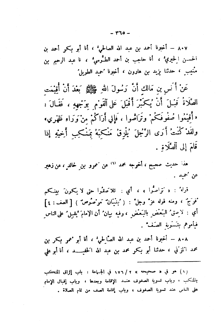 807 - أَخْبَرَنَا أَحْمَدُ بْنُ عَبْدِ اللَّهِ الصَّالِحِيُّ، أَنَا أَبُو بَكْرٍ أَحْمَدُ بْنُ الْحَسَنِ الْحِيرِيُّ، أَنَا حَاجِبُ بْنُ أَحْمَدَ الطُّوسِيُّ، نَا عَبْدُ الرَّحِيمِ بْنُ مُنِيبٍ، حَدَّثَنَا يَزِيدُ بْنُ هَارُونَ، أَخْبَرَنَا حُمَيْدٌ الطَّوِيلُ، عَنْ أَنَسِ بْنِ مَالِكٍ، أَنَّ رَسُولَ اللَّهِ صَلَّى اللهُ عَلَيْهِ وَسَلَّمَ بَعْدَ أَنْ أُقِيمَتِ الصَّلاةُ قَبْلَ أَنْ يُكَبِّرَ، أَقْبَلَ عَلَى الْقَوْمِ بِوَجْهِهِ، فَقَالَ: «أَقِيمُوا صُفُوفَكُمْ وَتَرَاصُّوا، فَإِنِّي أَرَاكُمْ مِنْ وَرَاءِ ظَهْرِي» وَلَقَدْ كُنْتُ أَرَى الرَّجُلَ يُلْزِقُ مَنْكِبَهُ بِمَنْكِبِ أَخِيهِ إِذَا قَامَ إِلَى الصَّلاةِ.