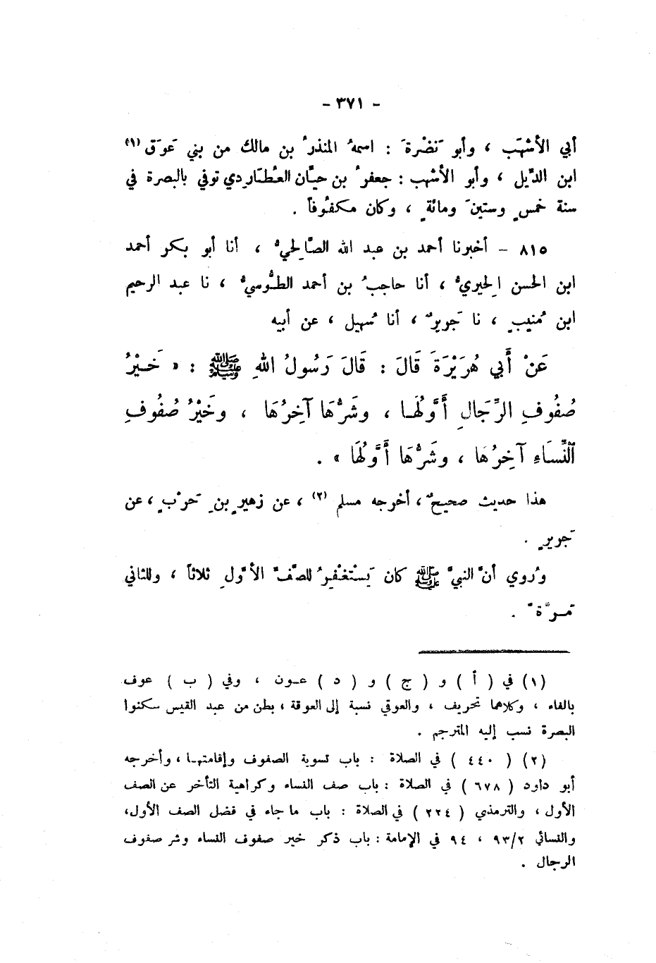 815 - أَخْبَرَنَا أَحْمَدُ بْنُ عَبْدِ اللَّهِ الصَّالِحِيُّ، أَنَا أَبُو بَكْرٍ أَحْمَدُ بْنُ الْحَسَنِ الْحِيرِيُّ، أَنَا حَاجِبُ بْنُ أَحْمَدَ الطُّوسِيُّ، نَا عَبْدُ الرَّحِيمِ بْنُ مُنِيبٍ، نَا جَرِيرٌ، أَنَا سُهَيْلٌ، عَنْ أَبِيهِ، عَنْ أَبِي هُرَيْرَةَ، قَالَ: قَالَ رَسُولُ اللَّهِ صَلَّى اللهُ عَلَيْهِ وَسَلَّمَ: «خَيْرُ صُفُوفِ الرِّجَالِ أَوَّلُهَا، وَشَرُّهَا آخِرُهَا، وَخَيْرُ صُفُوفِ النِّسَاءِ آخِرُهَا، وَشَرُّهَا أَوَّلُهَا».