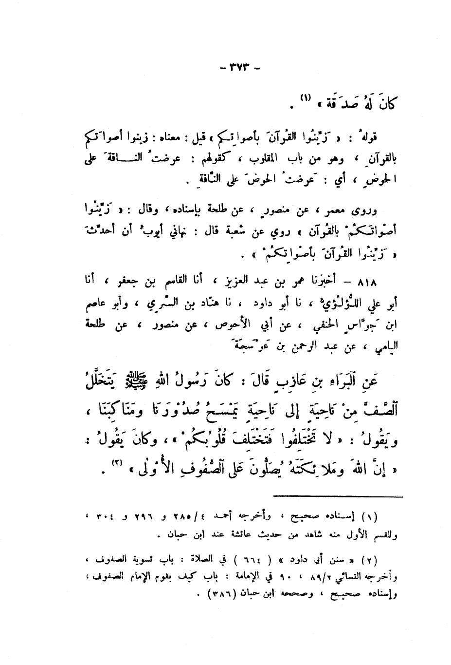 818 - أَخْبَرَنَا عُمَرُ بْنُ عَبْدِ الْعَزِيزِ، أَنَا الْقَاسِمُ بْنُ جَعْفَرٍ، أَنَا أَبُو عَلِيٍّ اللُّؤْلُئِيُّ، نَا أَبُو دَاوُدَ، نَا هَنَّادُ بْنُ السَّرِيِّ، وَأَبُو عَاصِمِ بْنُ جَوَّاسٍ الْحَنَفِيُّ، عَنْ أَبِي الأَحْوَصِ، عَنْ مَنْصُورٍ، عَنْ طَلْحَةَ الْيَامِيِّ، عَنْ عَبْدِ الرَّحْمَنِ بْنِ عَوْسَجَةَ، عَنِ الْبَرَاءِ بْنِ عَازِبٍ، قَالَ: كَانَ رَسُولُ اللَّهِ صَلَّى اللهُ عَلَيْهِ وَسَلَّمَ يَتَخَلَّلُ الصَّفَّ مِنْ نَاحِيَةٍ إِلَى نَاحِيَةٍ، يَمْسَحُ صُدُورَنَا وَمَنَاكِبَنَا، وَيَقُولُ: «لَا تَخْتَلِفُوا فَتَخْتَلِفَ قُلُوبُكُمْ»، وَكَانَ يَقُولُ: «إِنَّ اللَّهَ وَمَلائِكَتَهُ يُصَلُّونَ عَلَى الصُّفُوفِ الأُولَى»