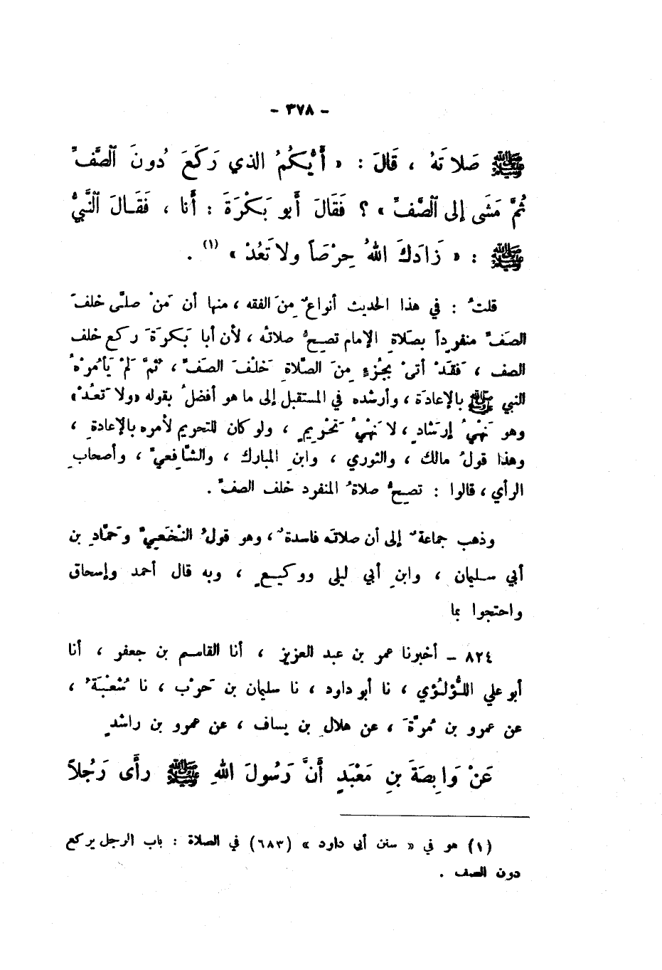 قُلْتُ: فِي هَذَا الْحَدِيثِ أَنْوَاعٌ مِنَ الْفِقْهِ، مِنْهَا أَنَّ مَنْ صَلَّى خَلْفَ الصَّفِّ مُنْفَرِدًا بِصَلاةِ الإِمَامِ تَصِحُّ صَلاتُهُ، لأَنَّ أَبَا بَكْرَةَ رَكَعَ خَلْفَ الصَّفِّ، فَقَدْ أَتَى بِجُزْءٍ مِنَ الصَّلاةِ خَلْفَ الصَّفِّ، ثُمَّ لَمْ يَأْمُرْهُ النَّبِيُّ صَلَّى اللهُ عَلَيْهِ وَسَلَّمَ بِالإِعَادَةِ، وَأَرْشَدَهُ فِي الْمُسْتَقْبَلِ إِلَى مَا هُوَ أَفْضَلُ بِقَوْلِهِ: «وَلا تَعُدْ» وَهُوَ نَهْيُ إِرْشَادٍ، لَا نَهْيُ تَحْرِيمٍ، وَلَوْ كَانَ لِلتَّحْرِيمِ لأَمَرَهُ بِالإِعَادَةِ، وَهَذَا قَوْلُ مَالِكٍ، وَالثَّوْرِيِّ، وَابْنِ الْمُبَارَكِ، وَالشَّافِعِيِّ، وَأَصْحَابِ الرَّأْيِ، قَالُوا: تَصِحُّ صَلاةُ الْمُنْفَرِدِ خَلْفَ الصَّفِّ.