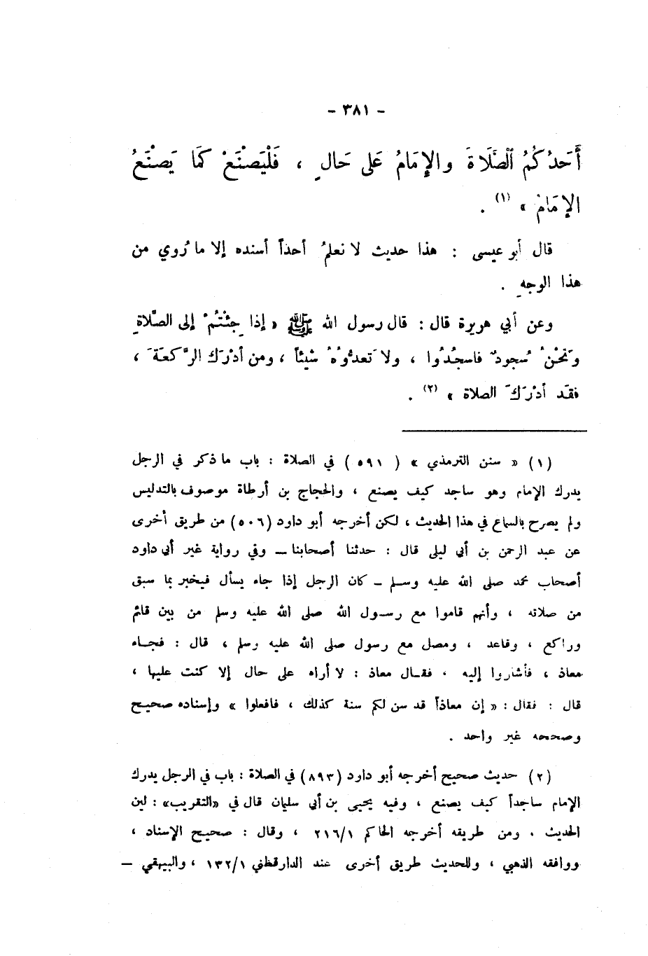 وَعَنْ أَبِي هُرَيْرَةَ، قَالَ: قَالَ رَسُولُ اللَّهِ صَلَّى اللهُ عَلَيْهِ وَسَلَّمَ: «إِذَا جِئْتُمْ إِلَى الصَّلاةِ وَنَحْنُ سُجُودٌ فَاسْجُدُوا، وَلا تَعُدُّوهُ شَيْئًا، وَمَنْ أَدْرَكَ الرَّكْعَةَ، فَقَدْ أَدْرَكَ الصَّلاةَ»