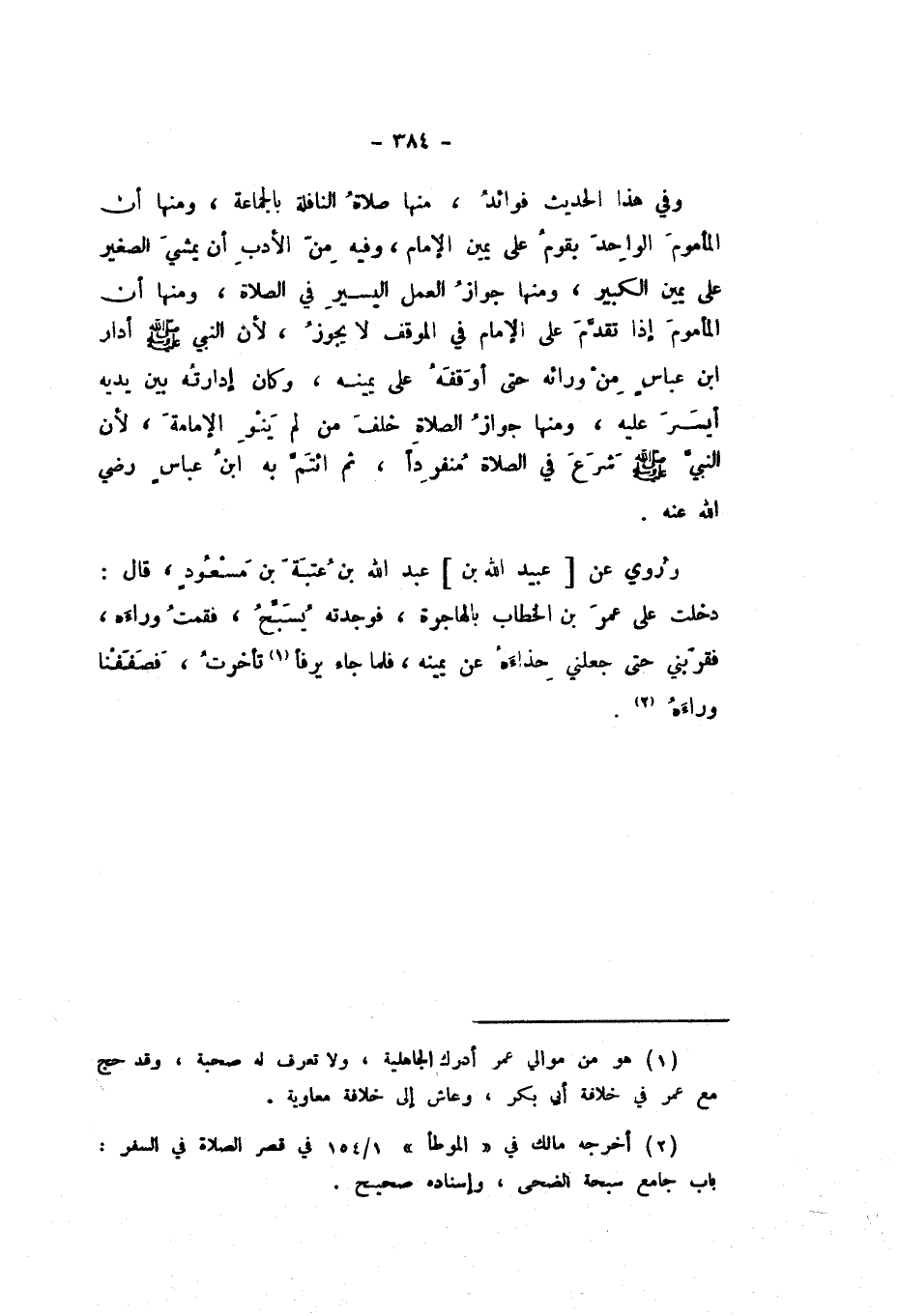 وَرُوِيَ عَنْ عُبَيْدِ اللَّهِ بْنِ عَبْدِ اللَّهِ بْنِ عُتْبَةَ بْنِ مَسْعُودٍ، قَالَ: «دَخَلْتُ عَلَى عُمَرَ بْنِ الْخَطَّابِ بِالْهَاجِرَةِ، فَوَجَدْتُهُ يُسَبِّحُ، فَقُمْتُ وَرَاءَهُ، فَقَرَّبَنِي حَتَّى جَعَلَنِي حِذَاءَهُ عَنْ يَمِينِهِ، فَلَمَّا جَاءَ يَرْفَأُ تَأَخَّرْتُ، فَصَفَفْنَا وَرَاءَهُ».